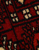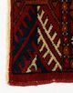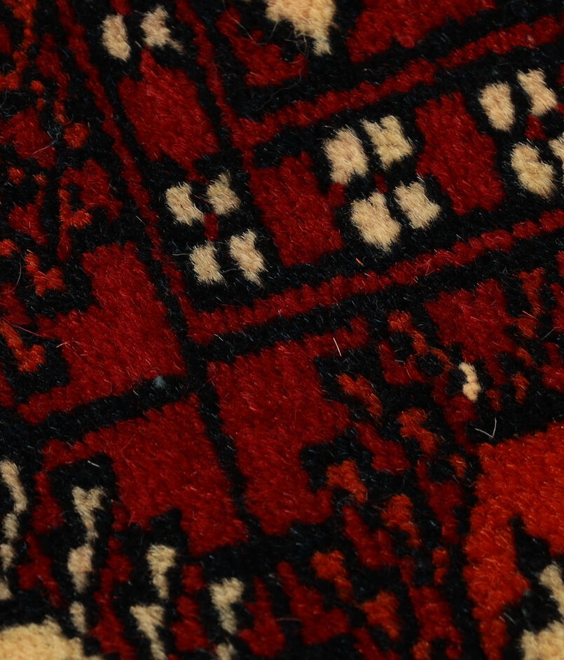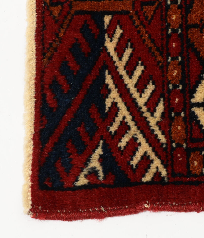このラグの魅力は、中央に並ぶギュル紋様で、ゾウの足跡など、部族の象徴を抽象化したこの幾何学模様が、深い濃赤のフィールドに繰り返され、絨毯全体にリズムと奥行きを生み出しています。