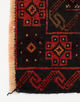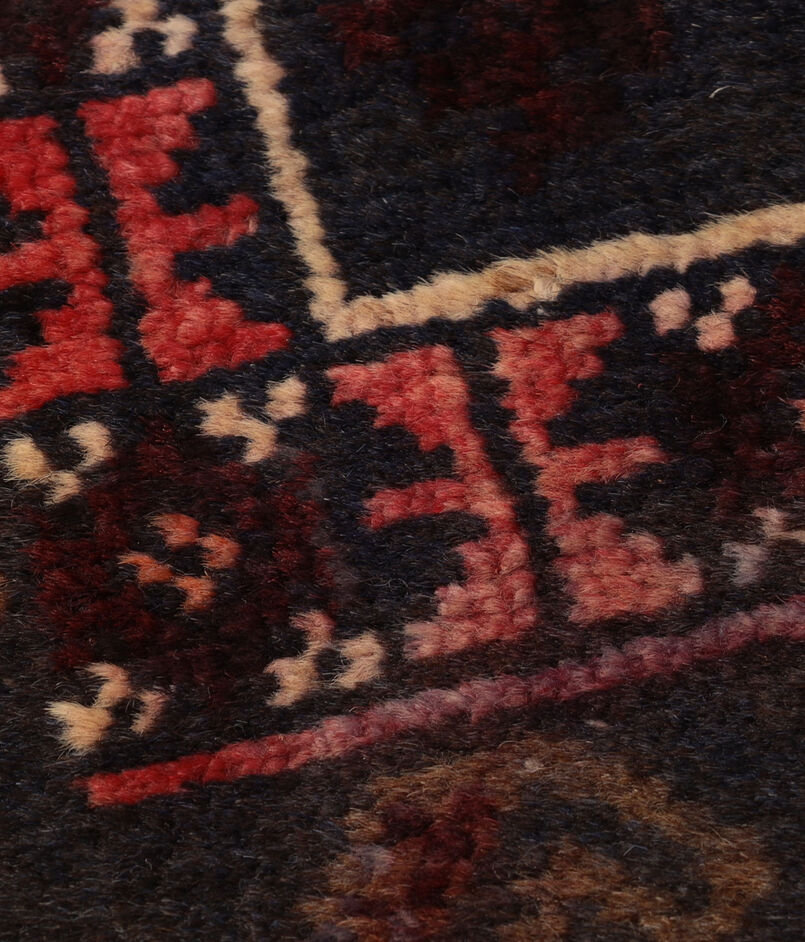 このラグの最大の特徴は、深く沈んだ濃紺のフィールドに、部族のシンボルを抽象化したような大きなモチーフが中央に並んでいる点で、周囲を彩る濃赤や茶色のボーダーと相まって、まるで壁画のような迫力と奥行きを感じさせます。