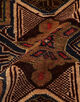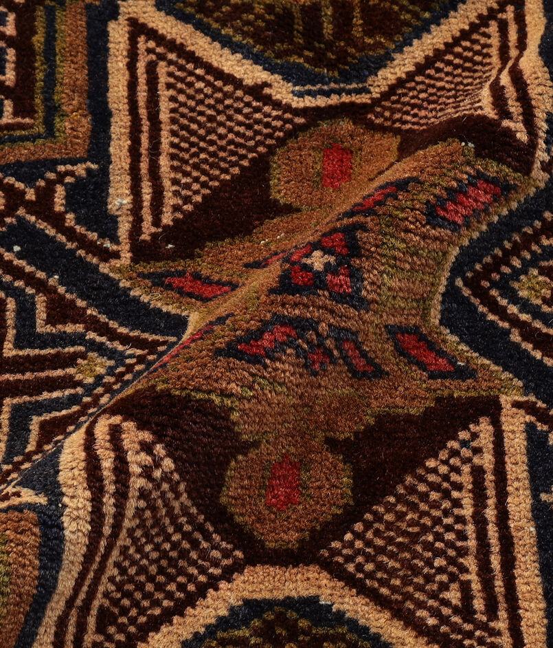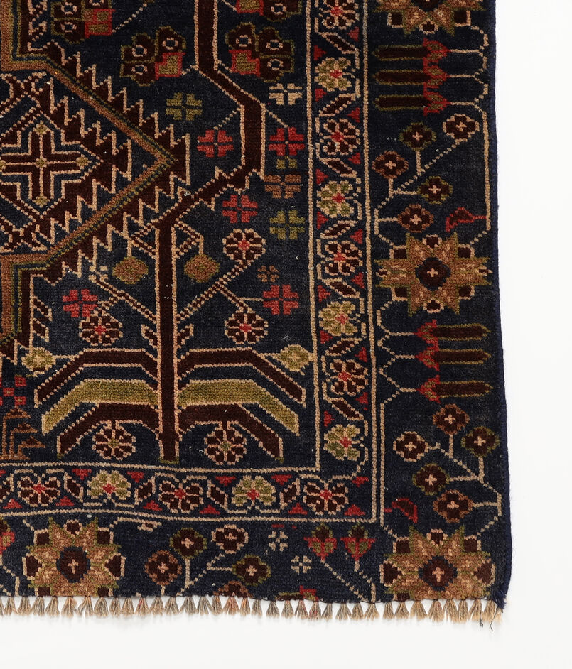 このラグの魅力は、深く落ち着いた濃藍(ダークインディゴ)のフィールド中央に、茶色、金、朱色、緑といった多種多様な色が組み合わされた幾何学モチーフが力強く縦に連なっている点で、菱形の中には、部族の様々なシンボルが凝縮されており、織り手の技術と感性が最高度に表現されています。