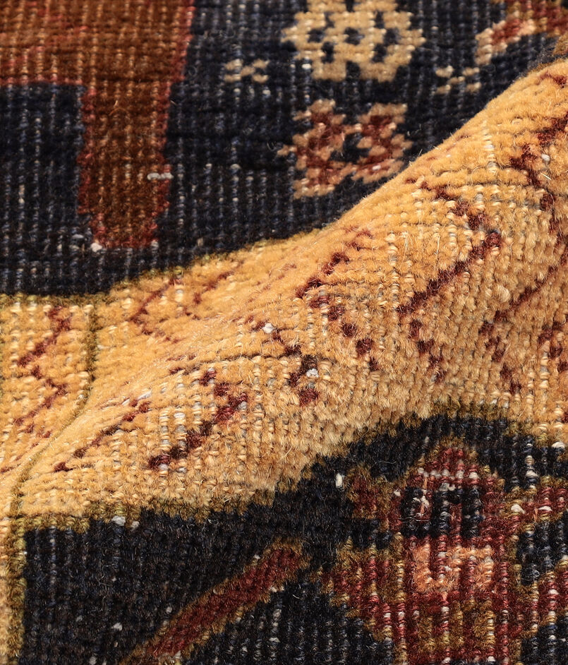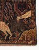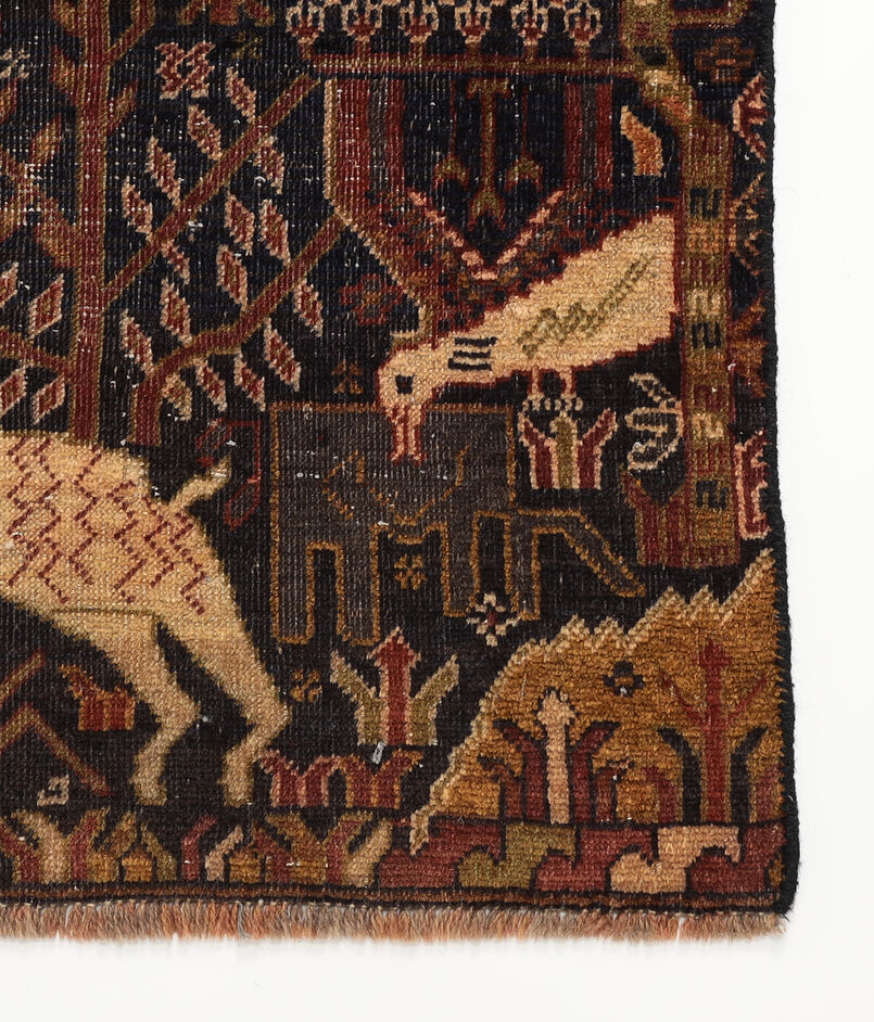 トライバルラグとしては珍しい、具象的な「生命の木」と「鹿(シカ)」のモチーフがフィールド全体に織り込まれ、一枚の物語絵巻のような様相。