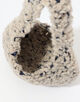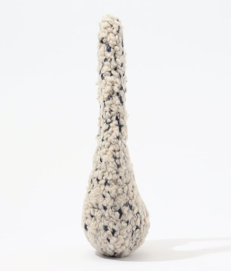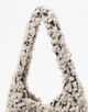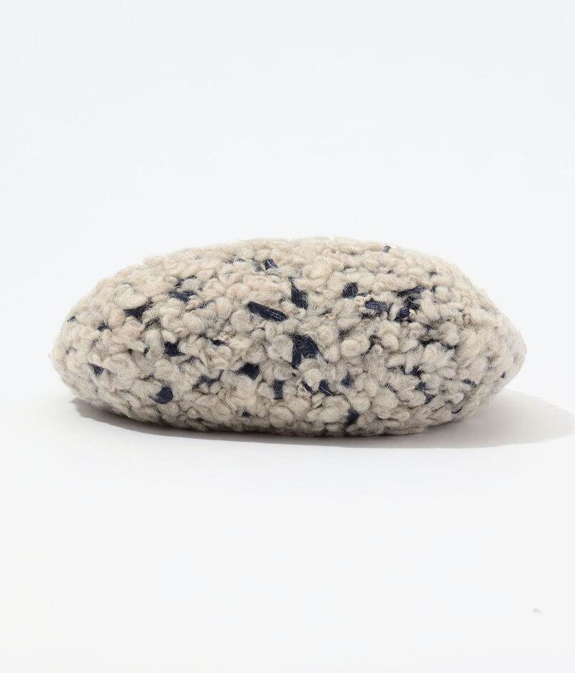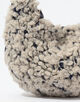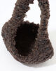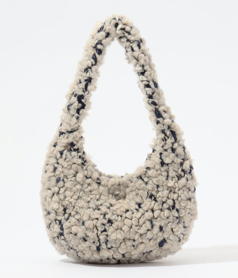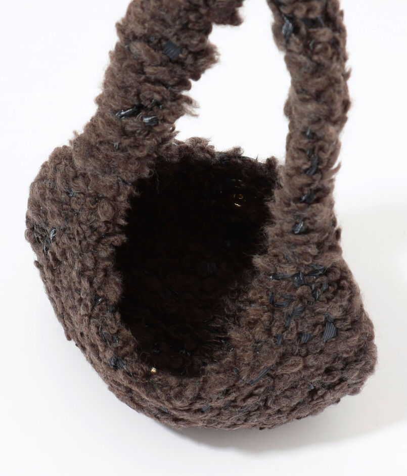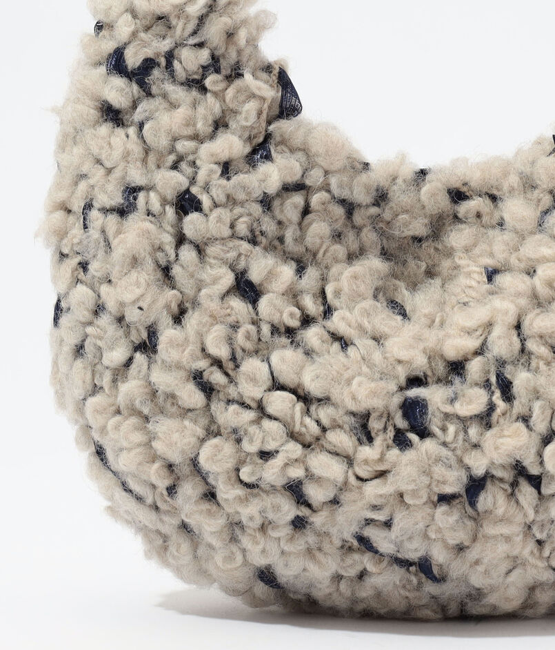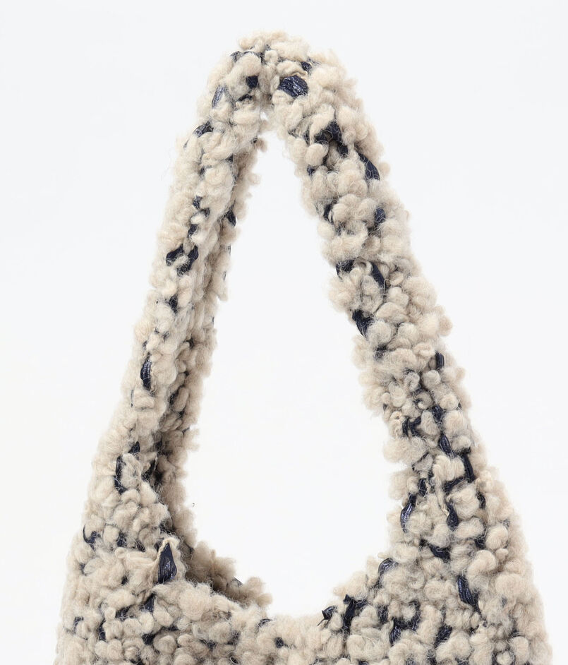 国内に1台しかない貴重な経編機で一目ずつゆっくりと編み込まれた1ゲージのウール糸と、テープ上の極広ナイロン糸を編み合わせたモコモコのハンドニットバッグ。