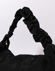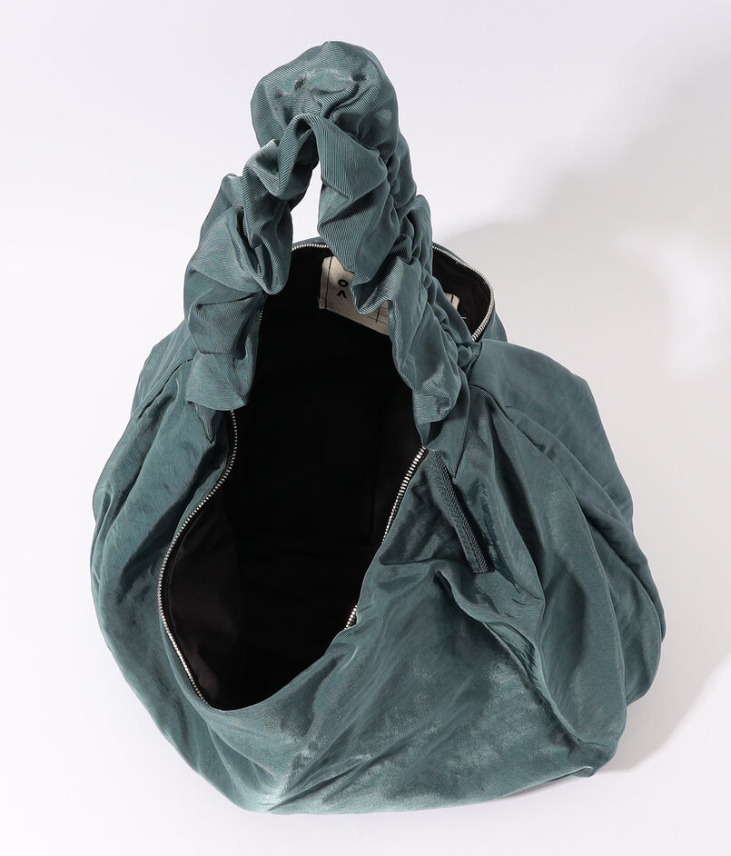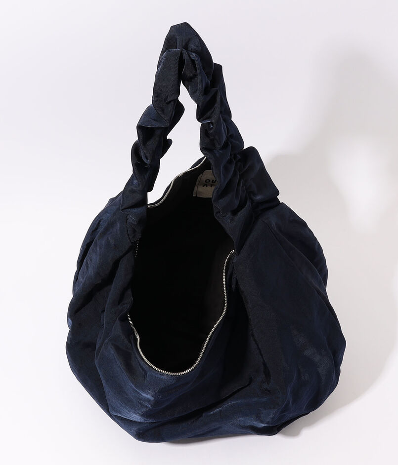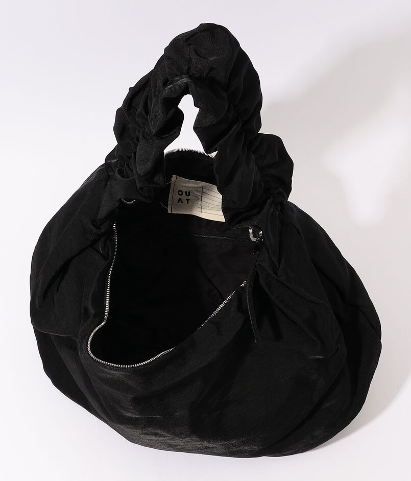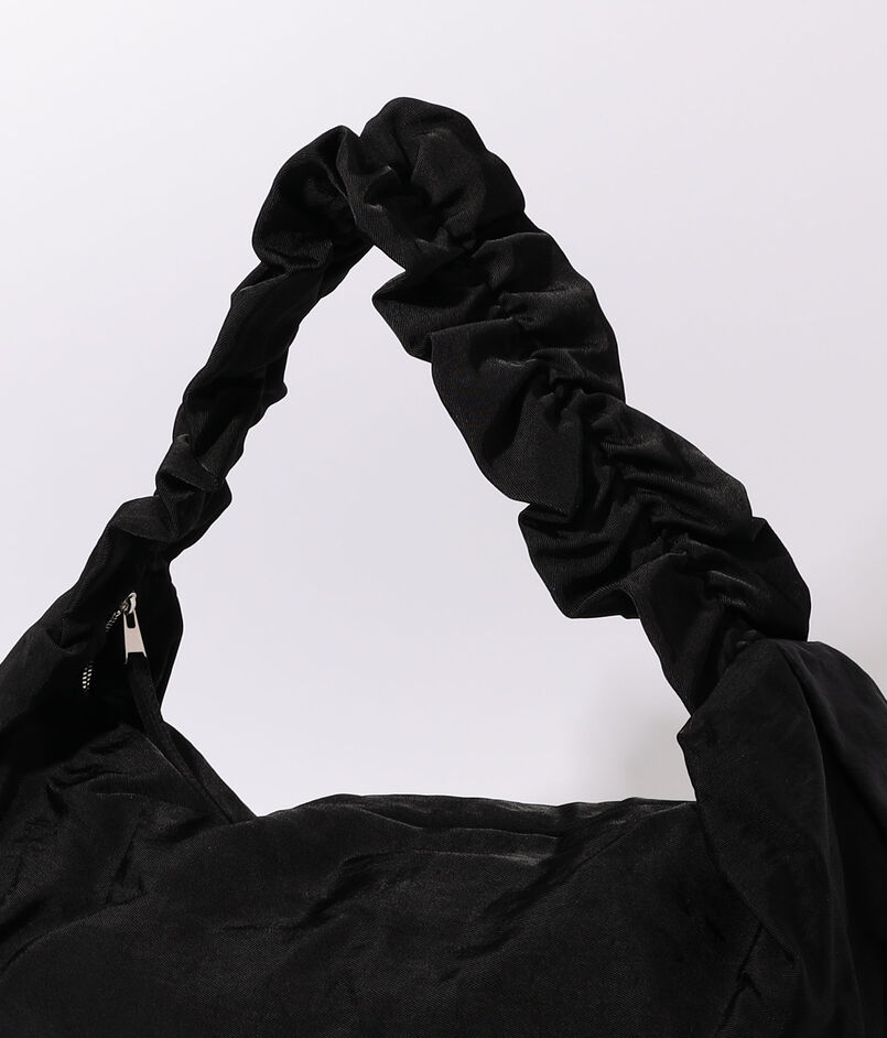 ギャザーの肩紐、高級感のあるファスナークロージャー、クロージャーの大きな2つの内ポケット。