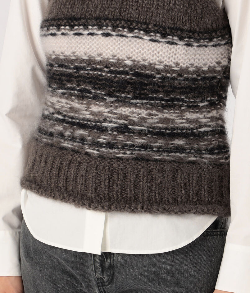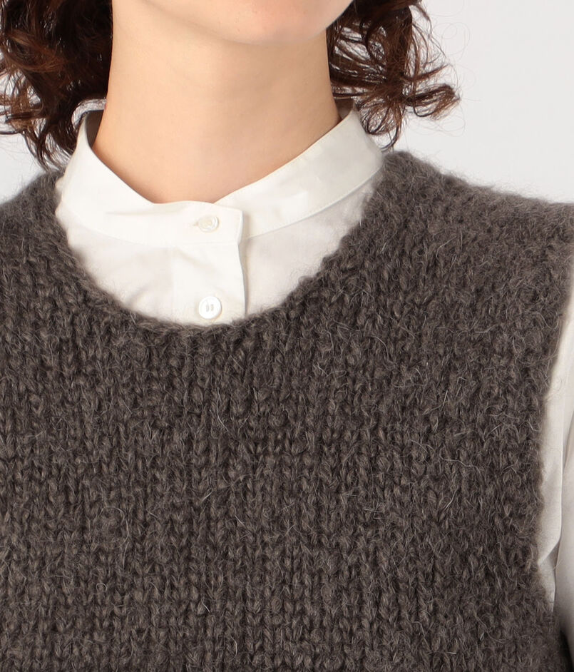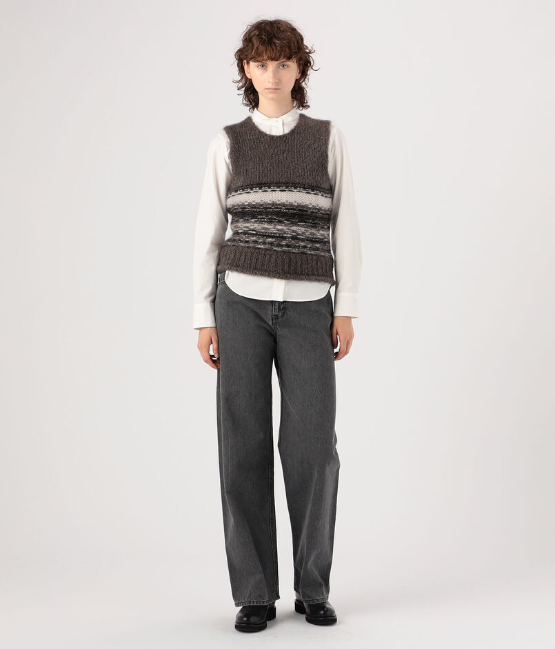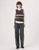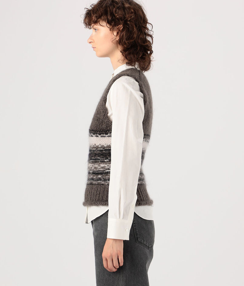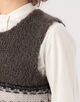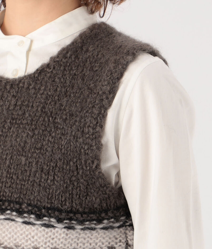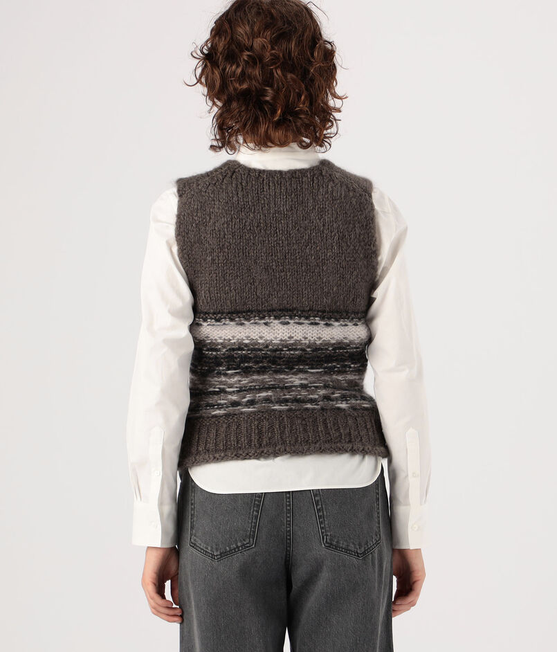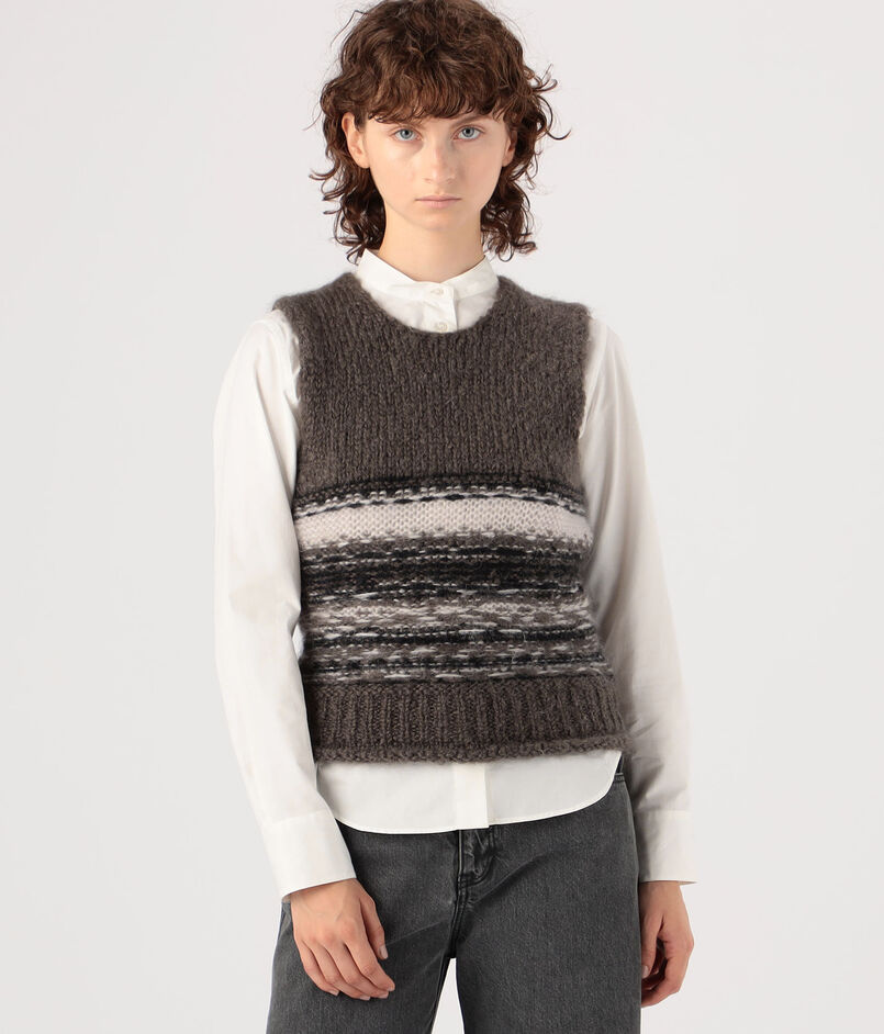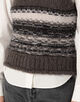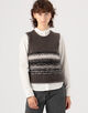 落ち着いたトーンながらも、ユニークなフェアアイル柄が印象的なニットベスト。