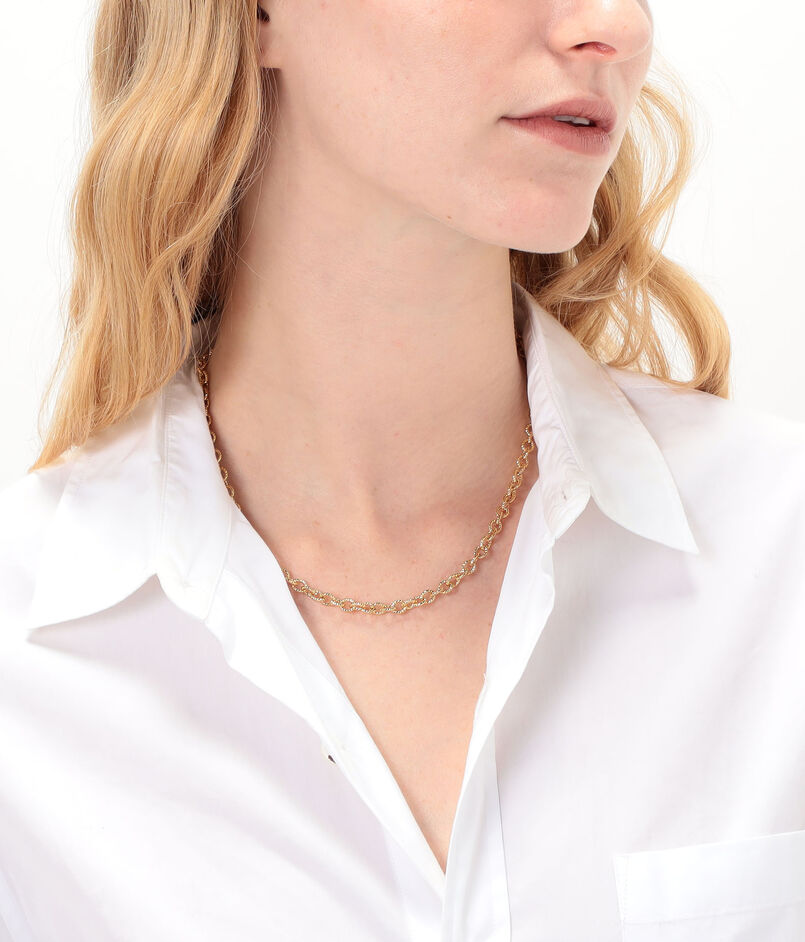 繊細な細線をダブルリンクで組み上げることで、軽やかさの中にほどよいボリューム感を持たせています。