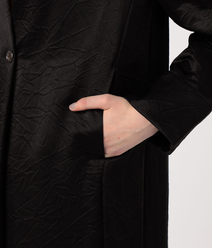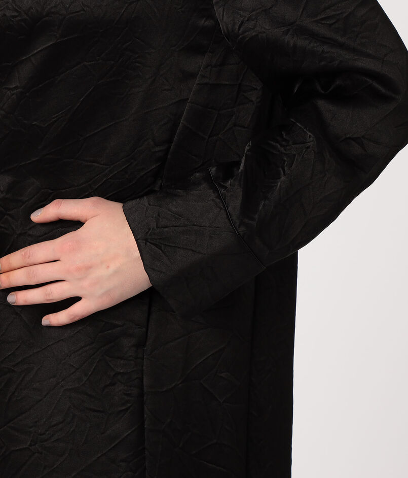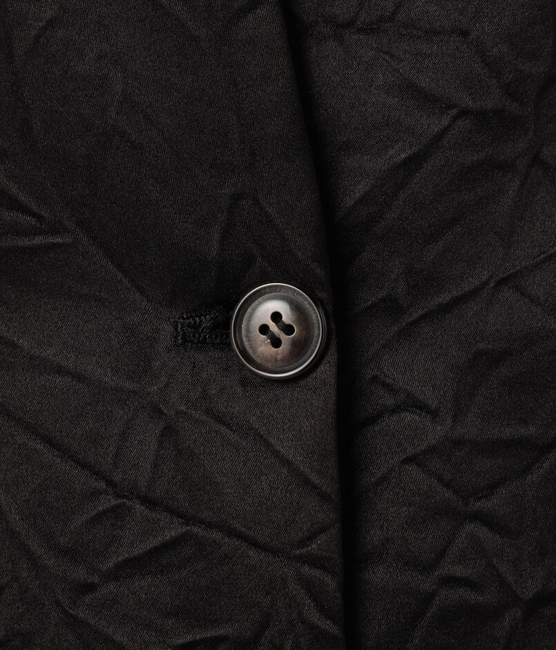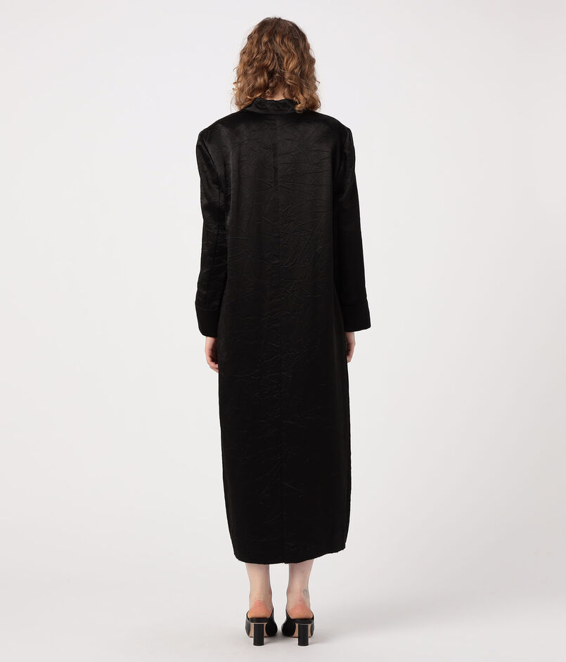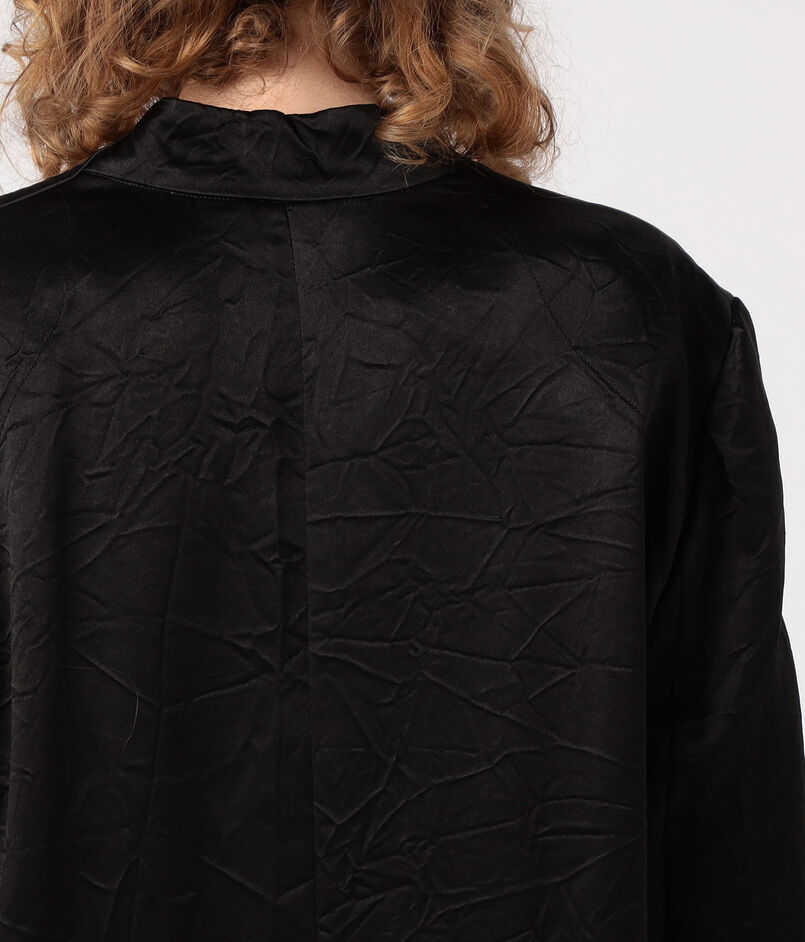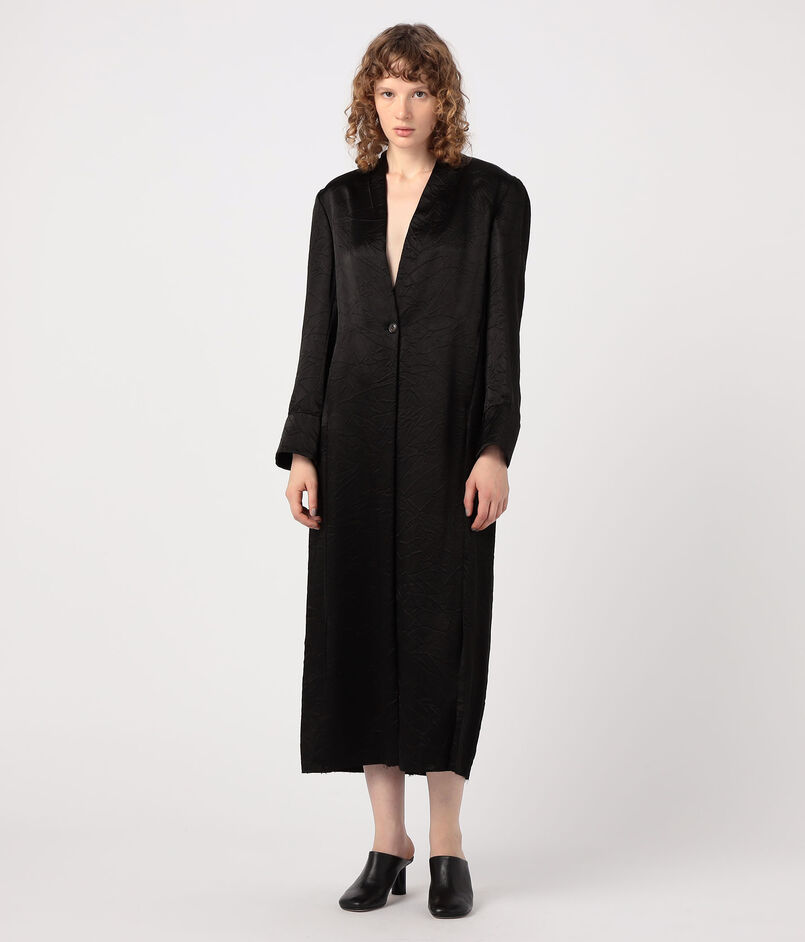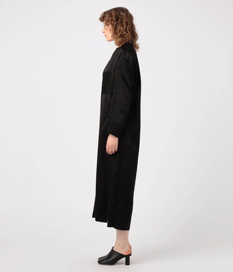 表面的な飾りを潔く削る反面、手の温かみによって作られた切り替えのラインが有機的で、女性の体が見え隠れするフォルムは、着るものにも見るものにも感情に熱を帯させる。