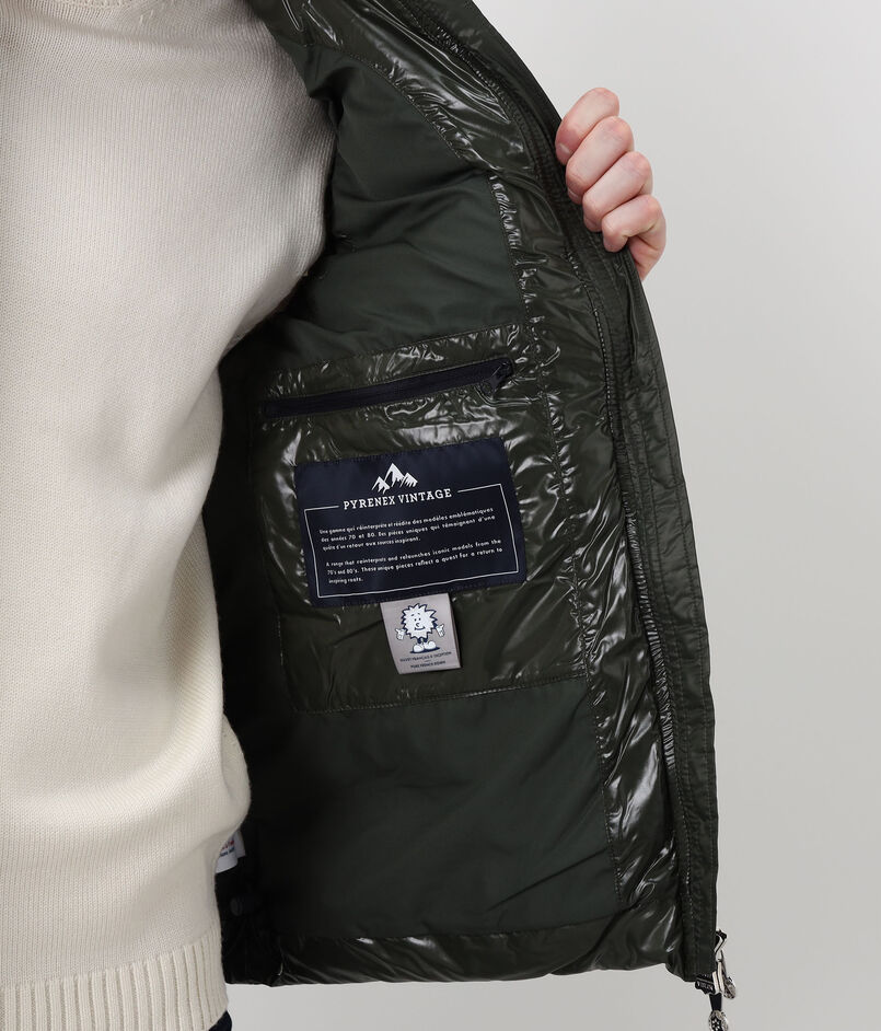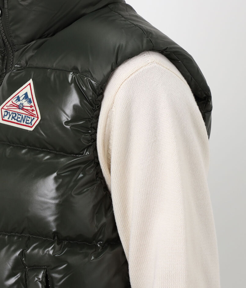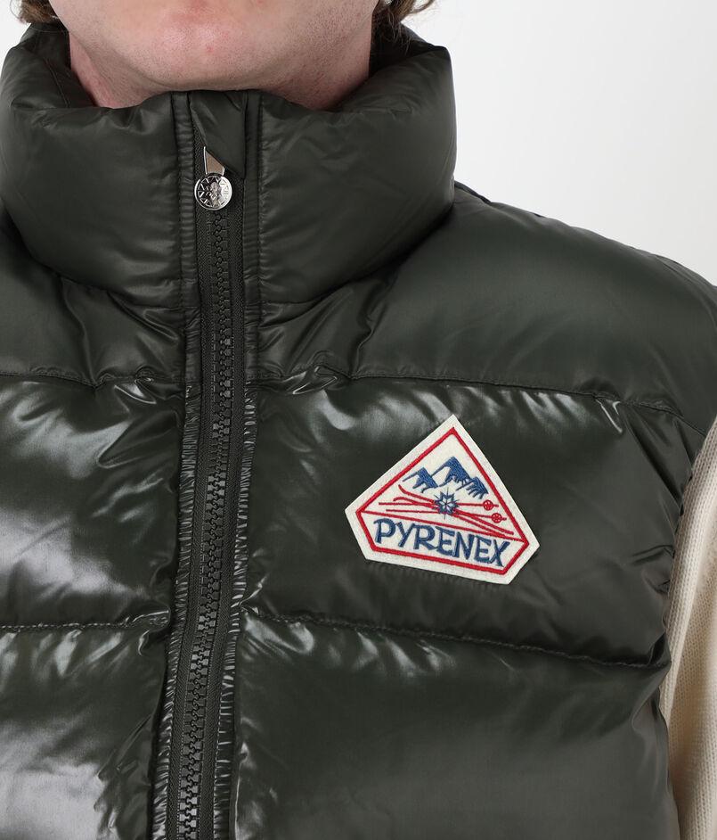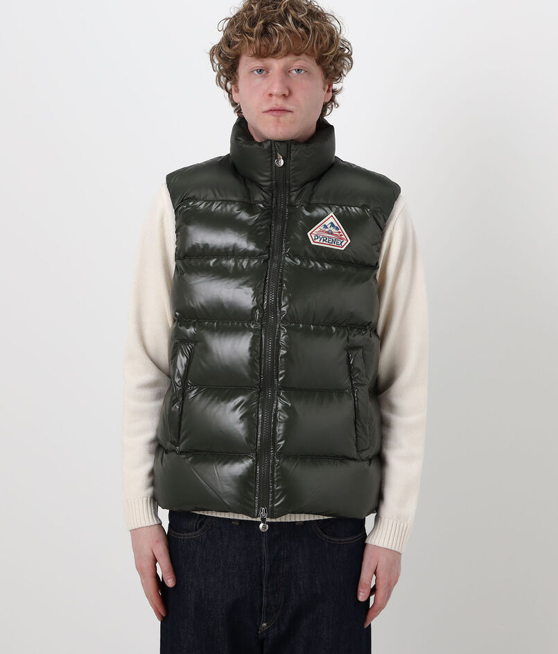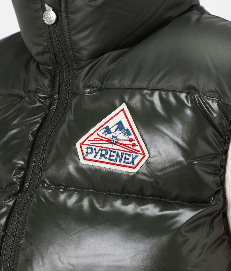 光沢のある撥水加工のヴィンテージ生地に、大きなピレネックス・ヴィンテージのバッジがあしらわれたダウンベスト。
