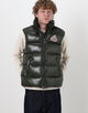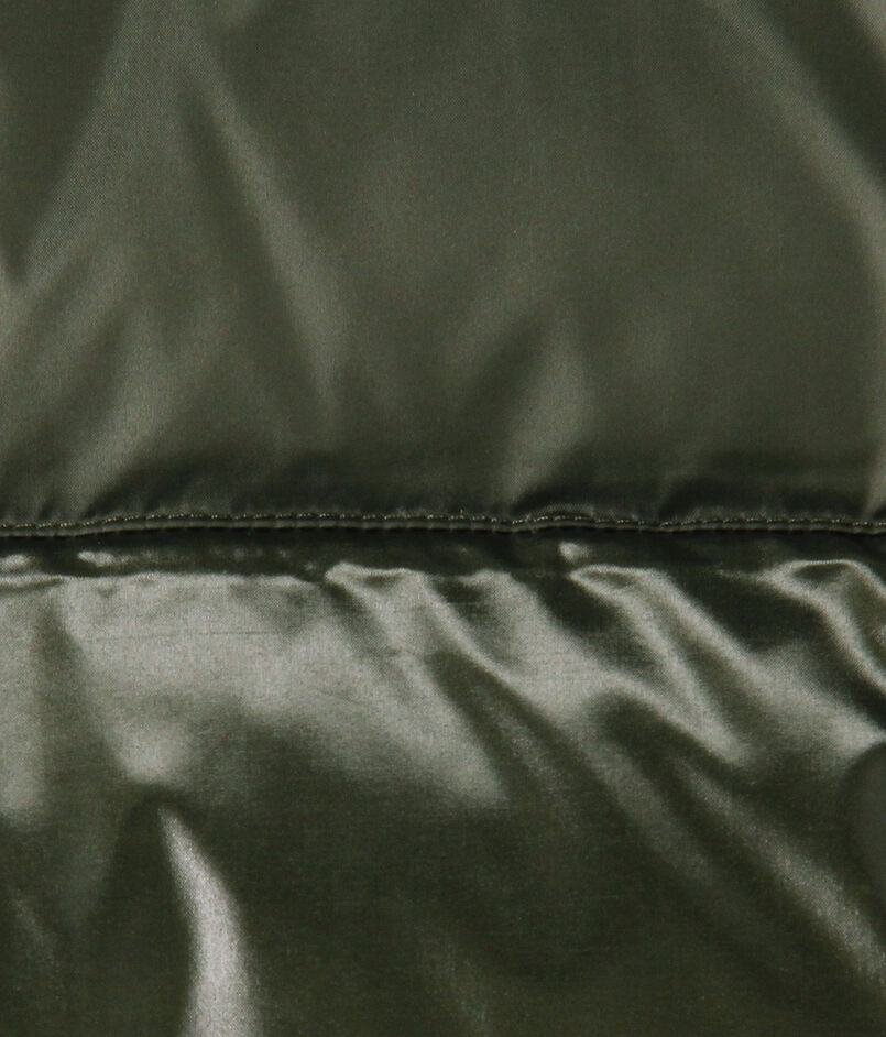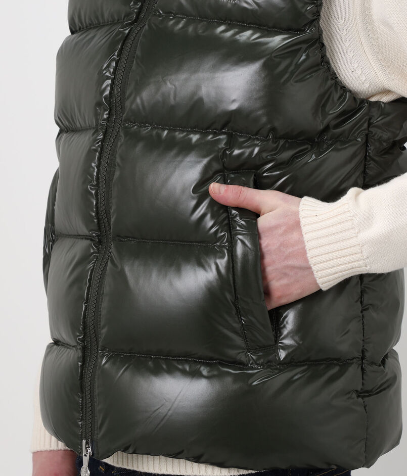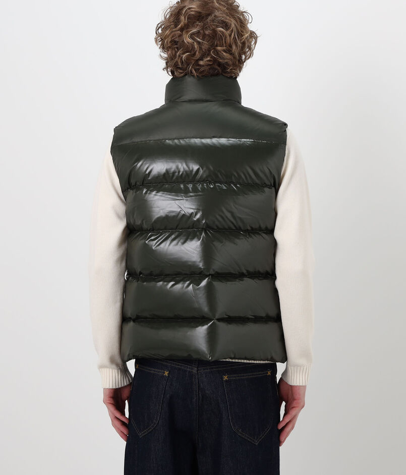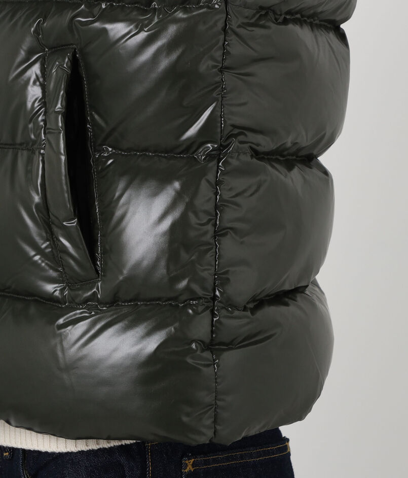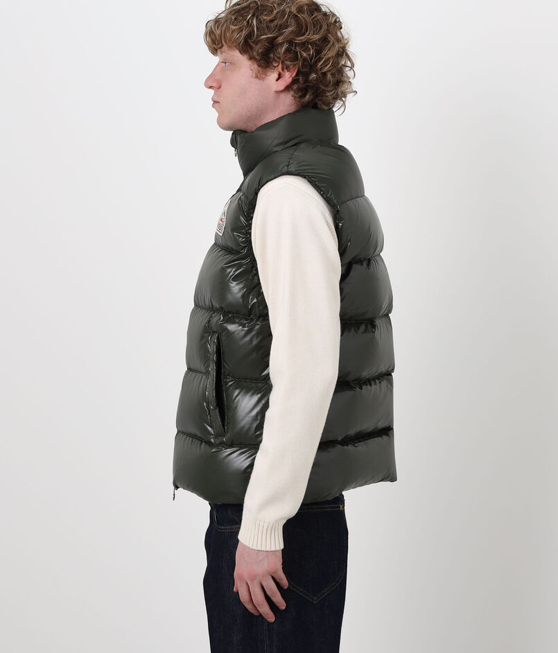 光沢のある撥水加工のヴィンテージ生地に、大きなピレネックス・ヴィンテージのバッジがあしらわれたダウンベスト。