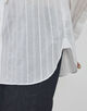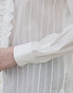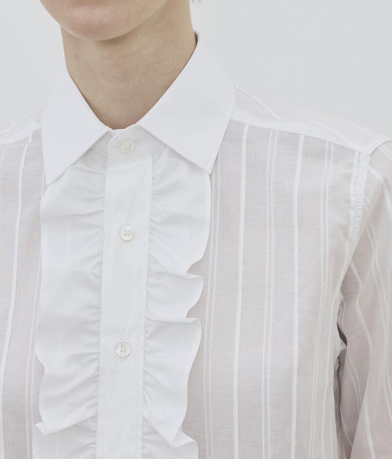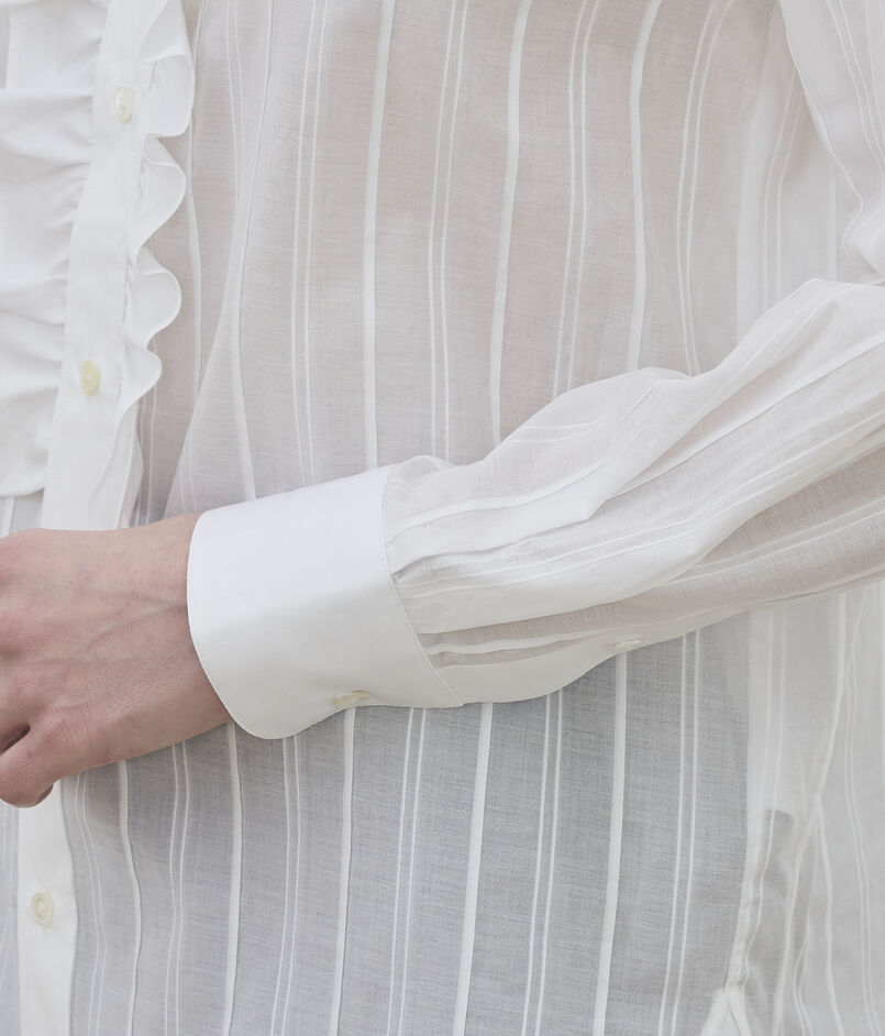ラッフルディテールがフェミニンながらも、シャープなストライプがマニッシュな印象を与えてくれるブラウス。