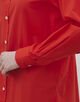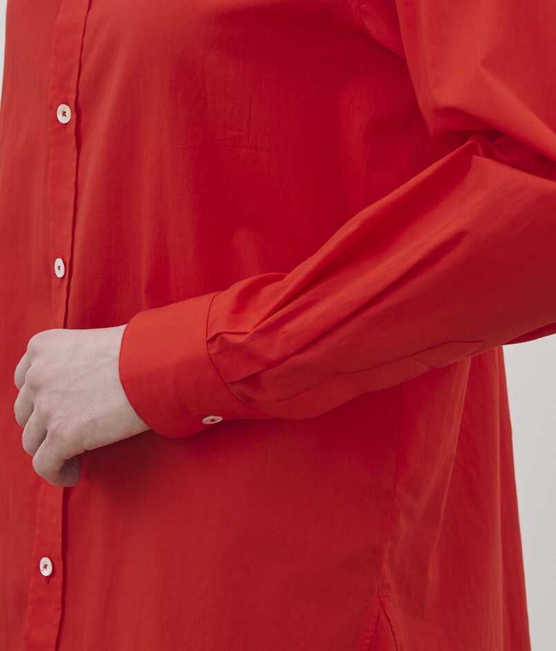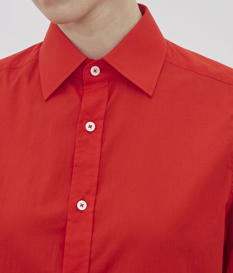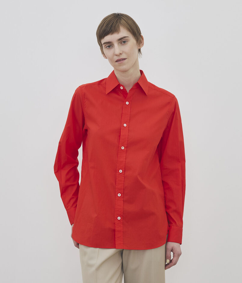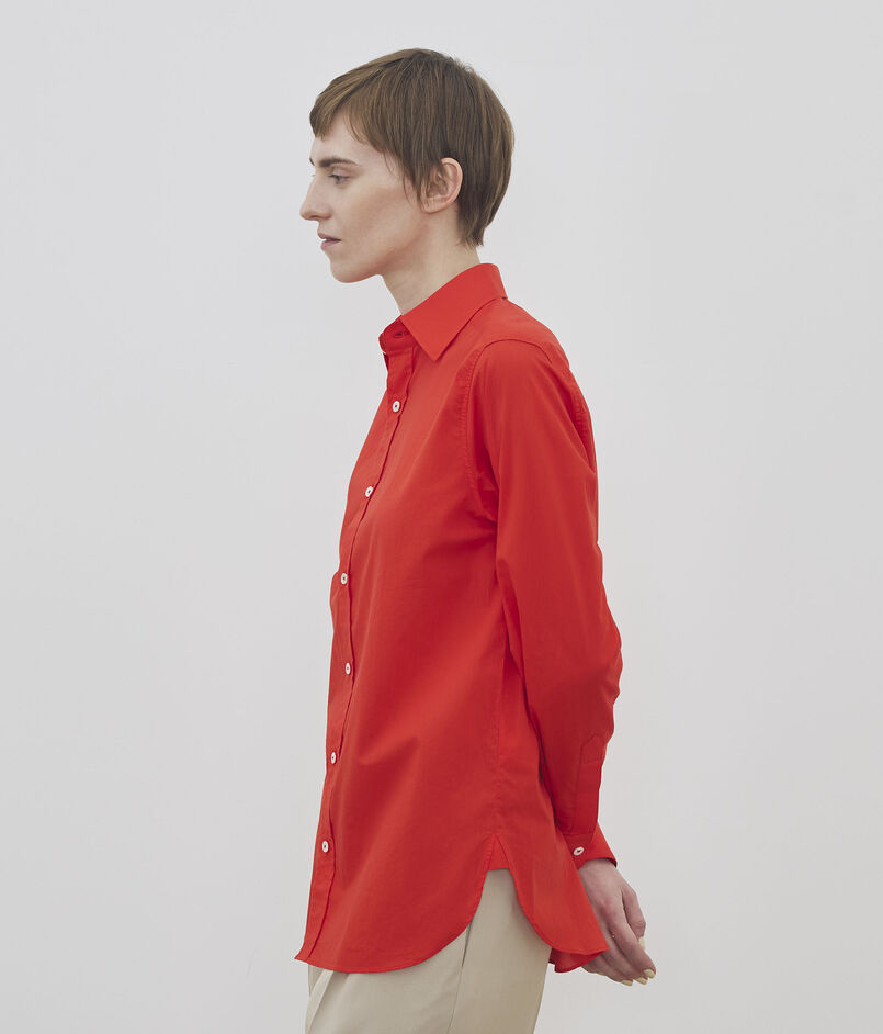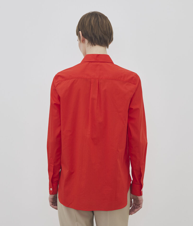 ビビットなレッドが華やかな印象と今年らしさをプラスしてくれる、モードなワークシャツ。