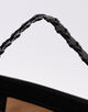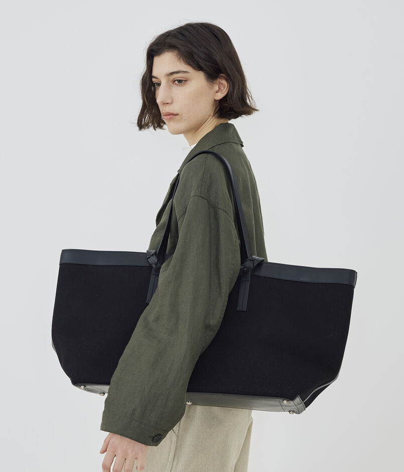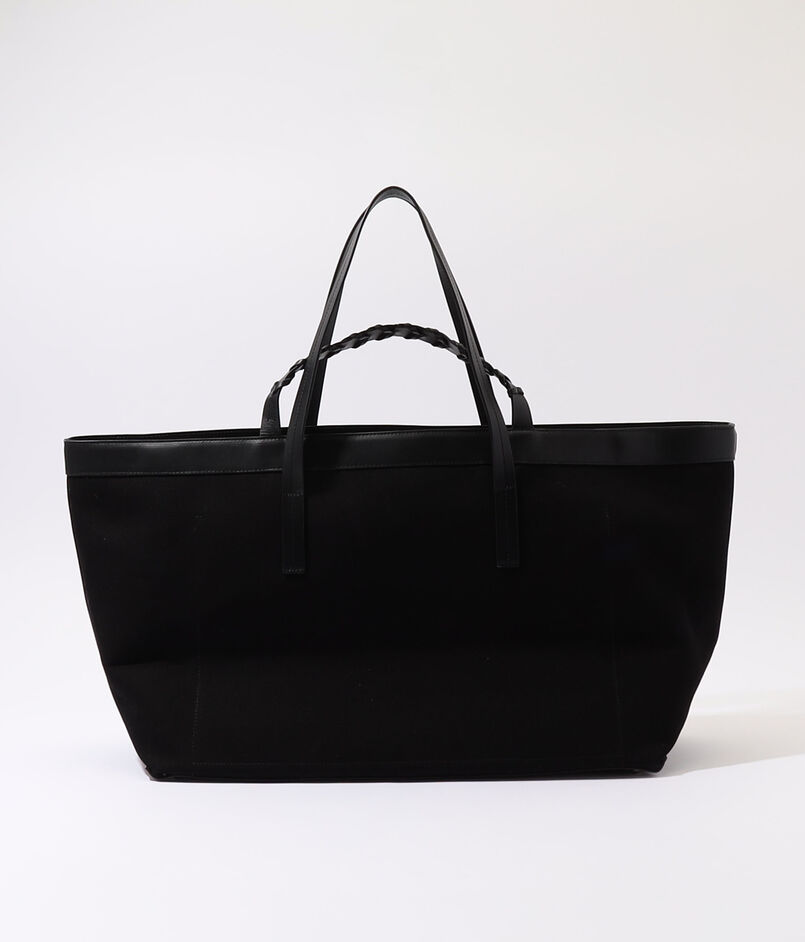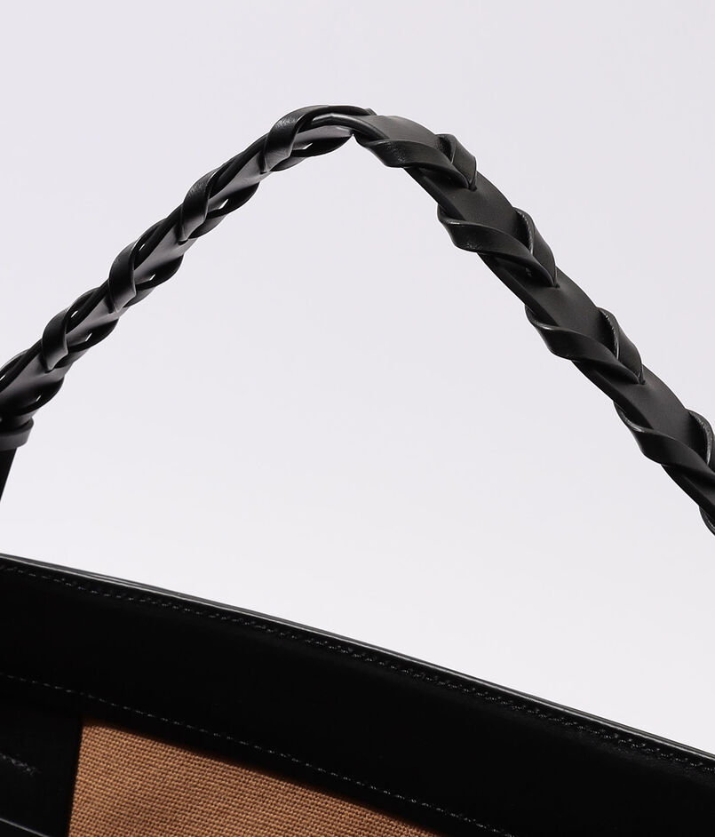 横長のフォルムとレザーディテールが上品かつモードな印象で、開口部の留め具としても機能する手編みのショートハンドルがポイントです。