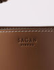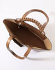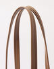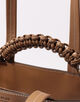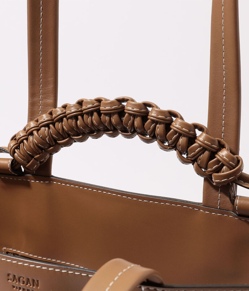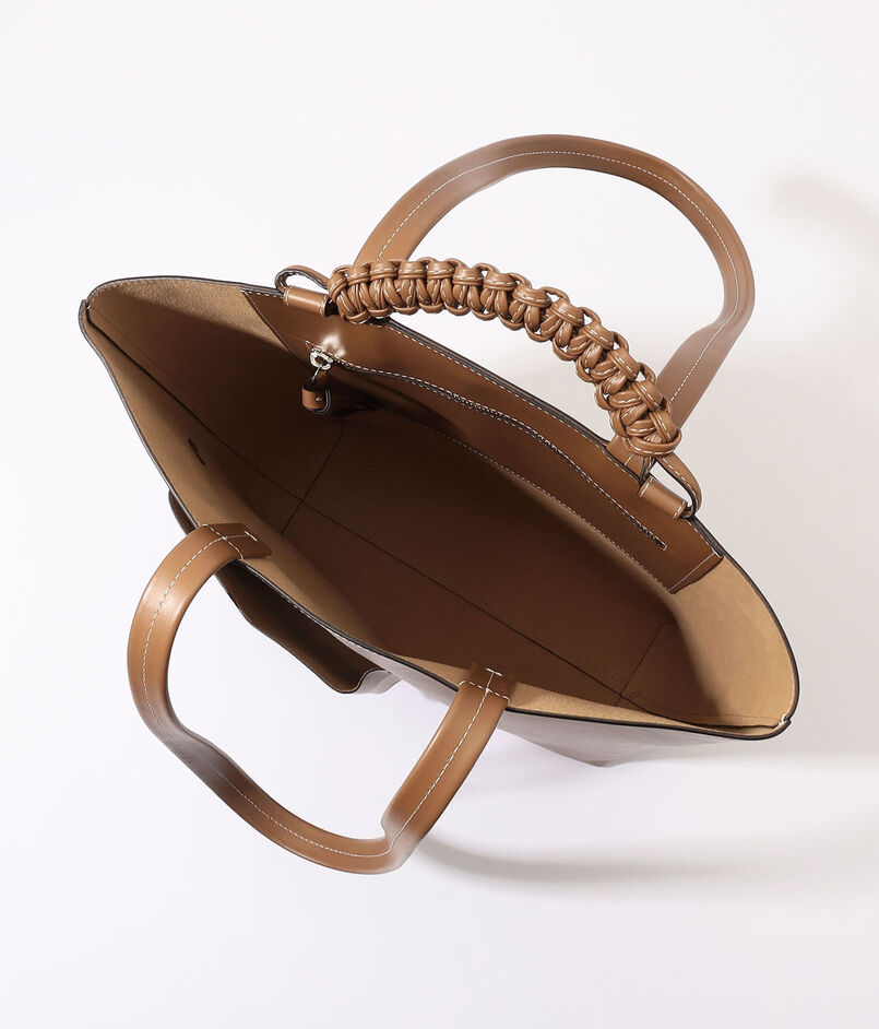 ブランドのシグネチャーディテールである職人手編みのレザーハンドルは開口部の留め具としても機能します。