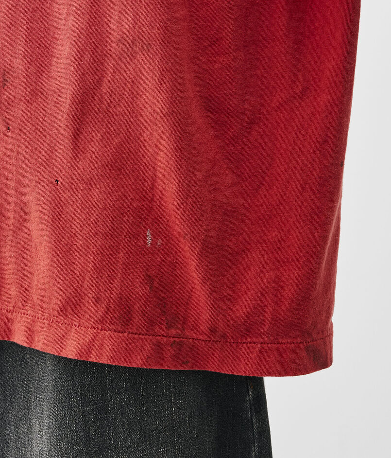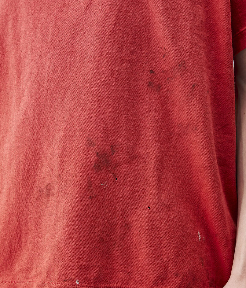 硫化染めとストーンウォッシュを施し、手作業によるダメージやペイント手法を用いたTシャツは、時を経たヴィンテージさながらの存在感を放ちます。