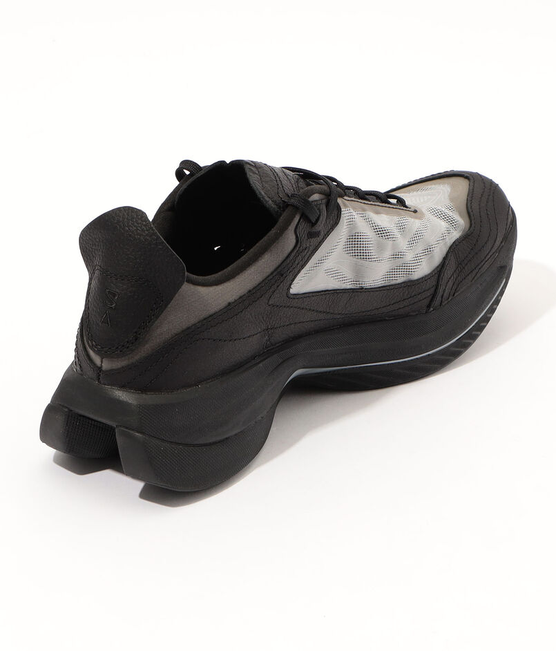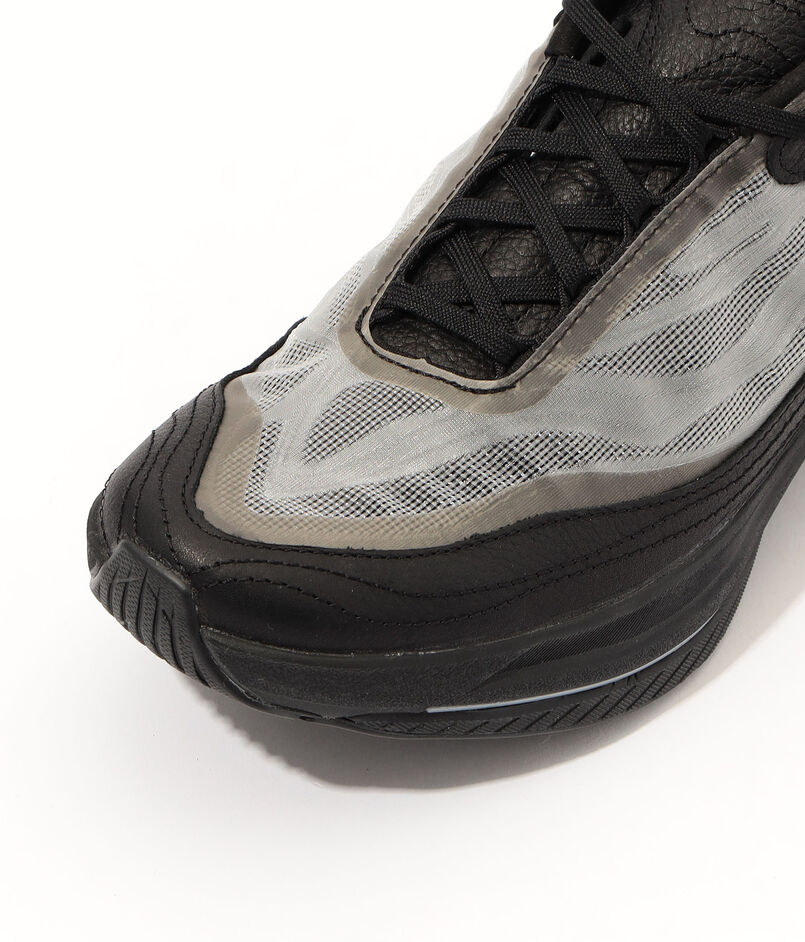 アッパーは通気性に優れたメッシュにフルグレインレザーのオーバーレイを重ね、多層的な構造で立体感とホールド性を実現。