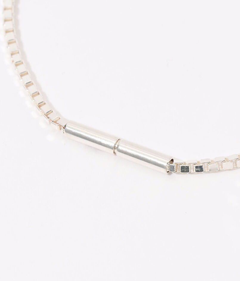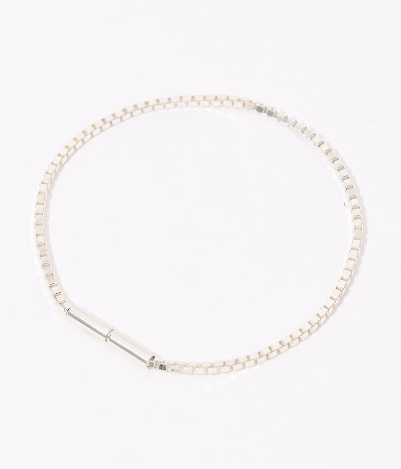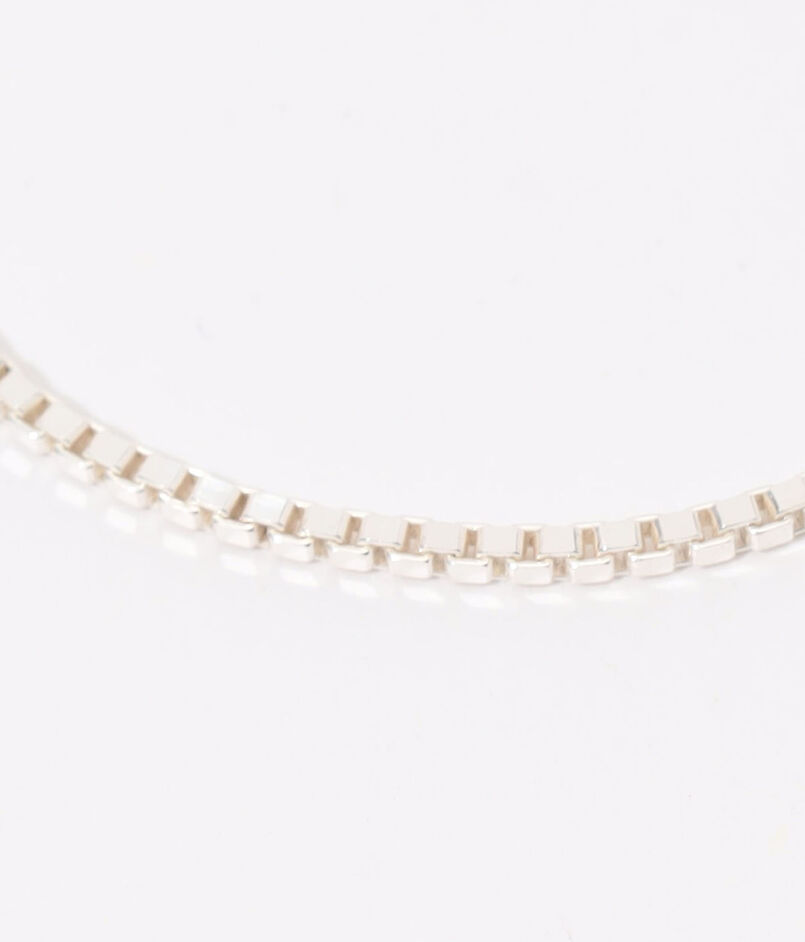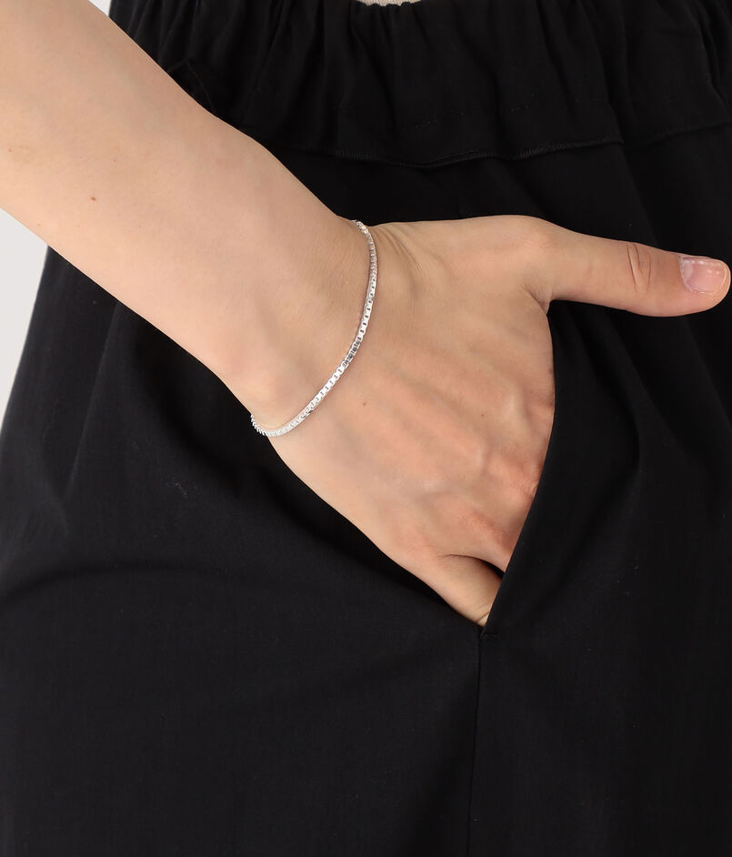ボックスチェーンが手元に煌めきをもたらし、コーディネートをきりりと引き締めてくれるブレスレット。