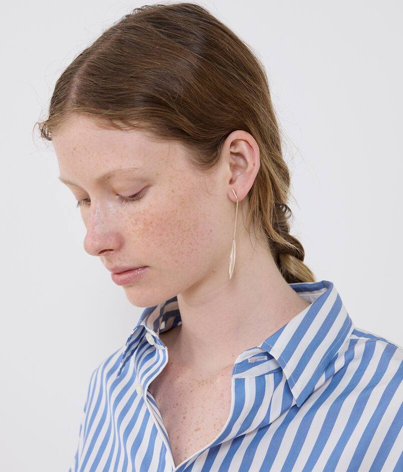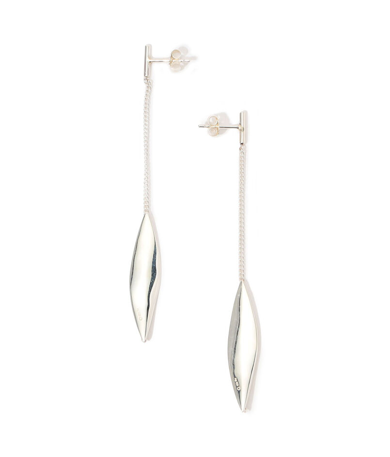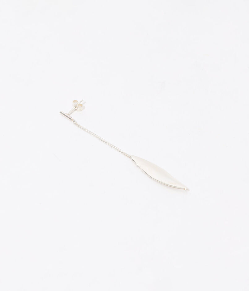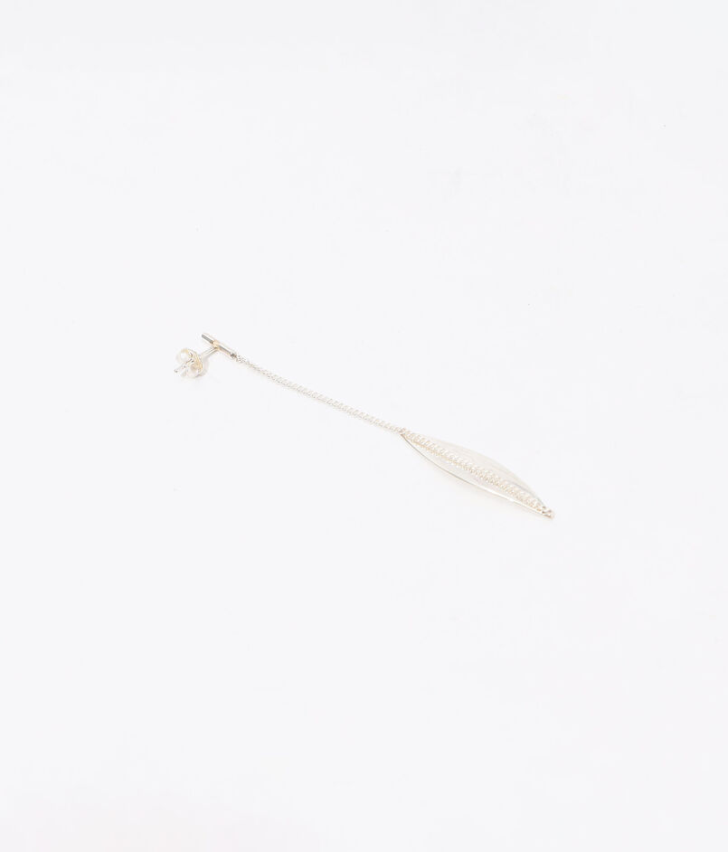 細いチェーンに吊るされたピースは細長い葉を思わせ、動きに合わせて光を捉えます。