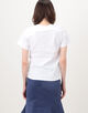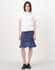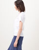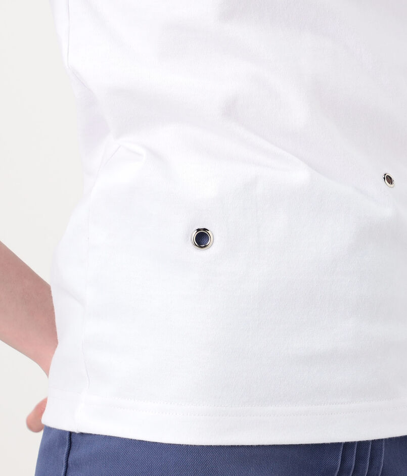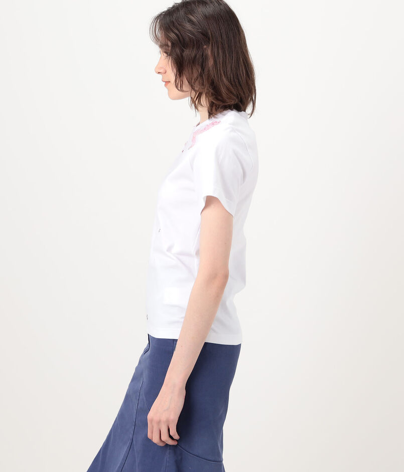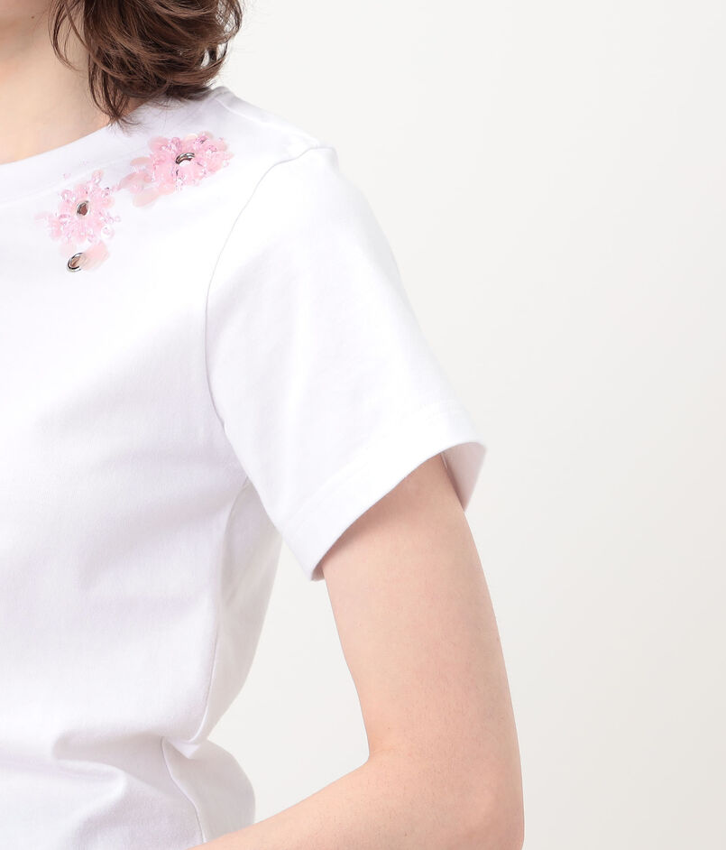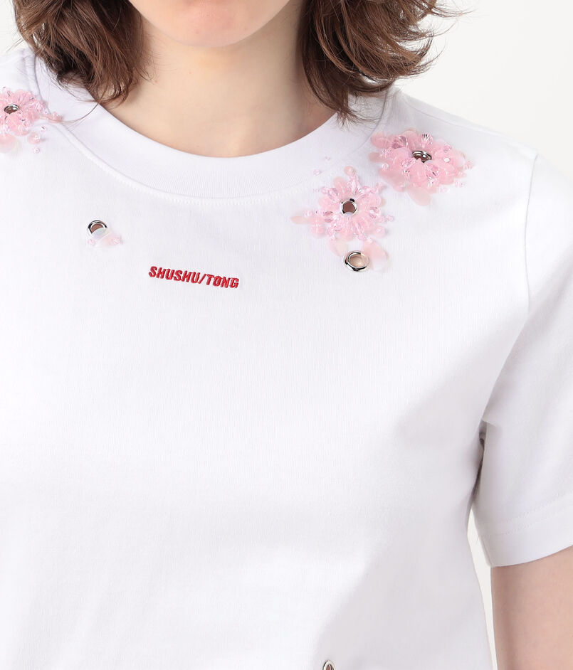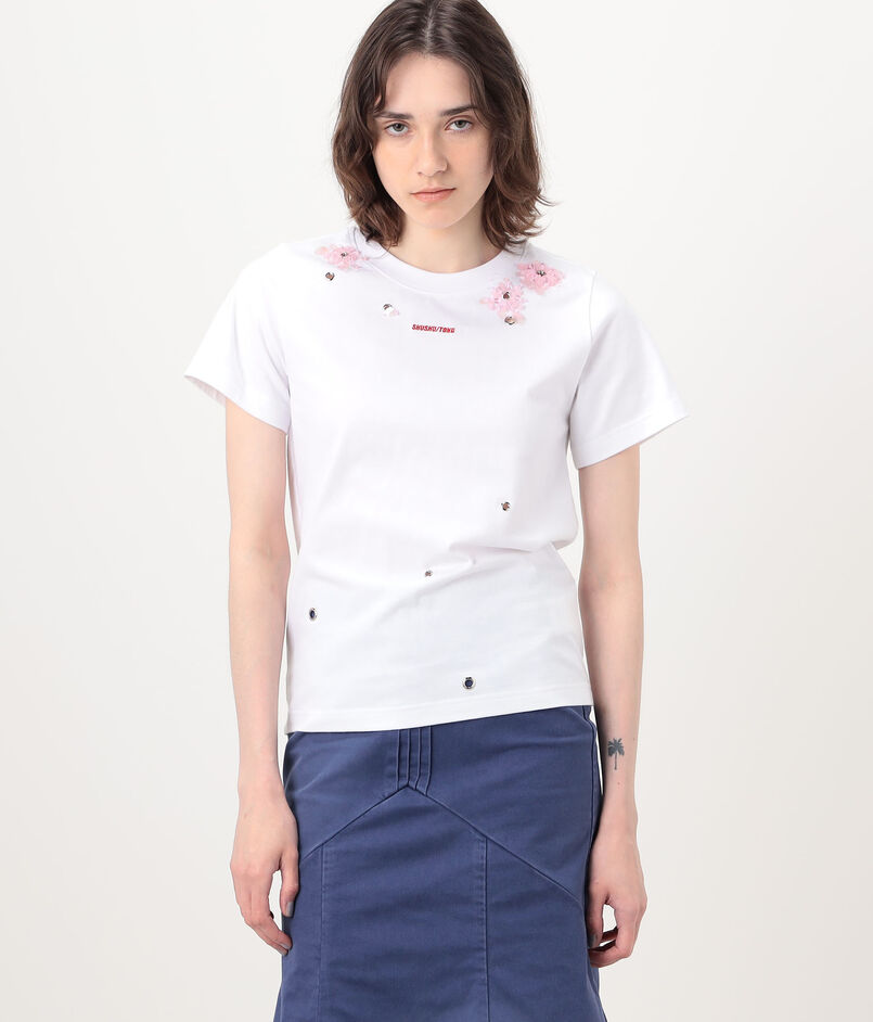 ランダムに配したモードなハトメを、立体的なフラワーモチーフの刺繍でフェミニンに飾った、相反するイメージを一枚にのせたTシャツ。