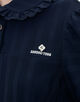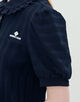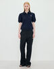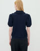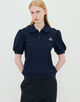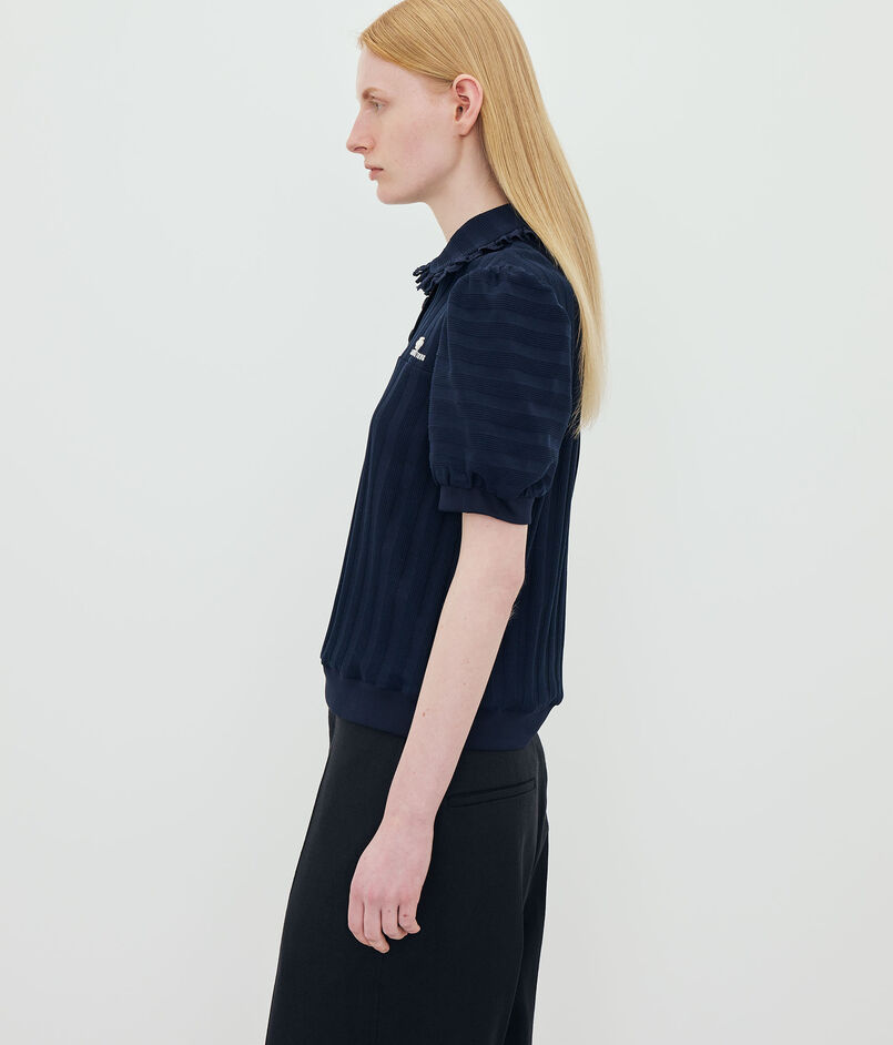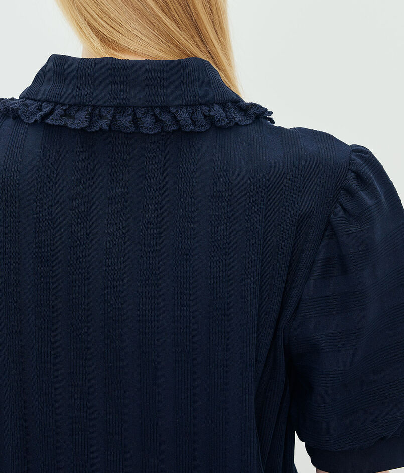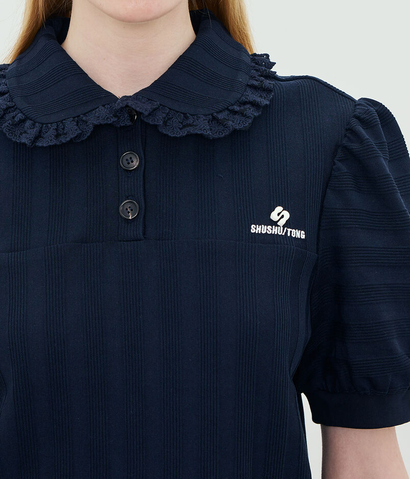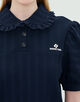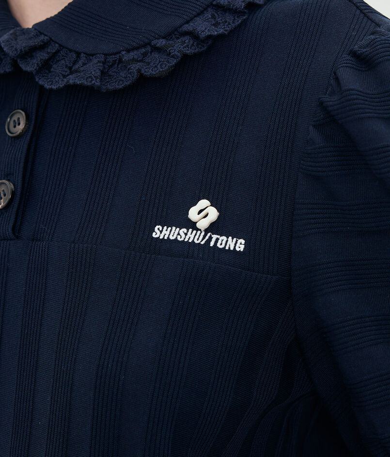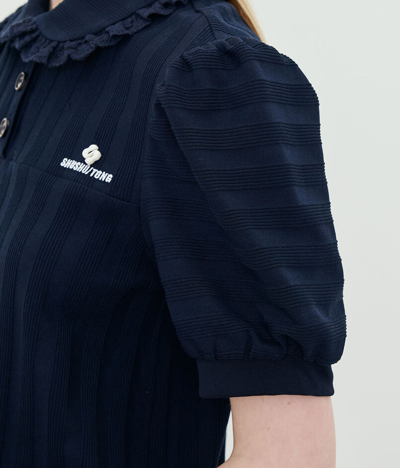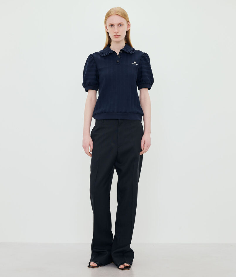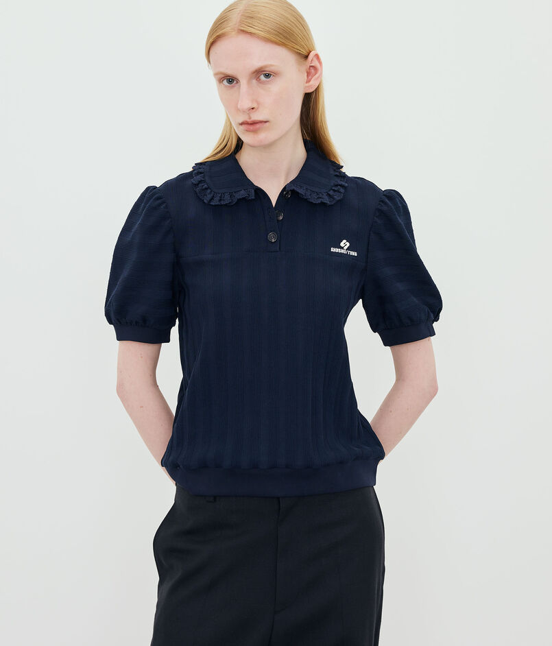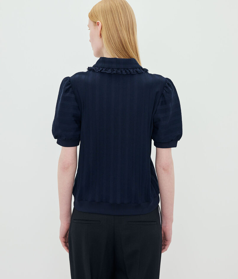 スポーティーなポロシャツをベースに、レースフリルやパフスリーブなどフェミニンなディテールをふんだんに掛け合わせた、今季らしいムードの一着です。