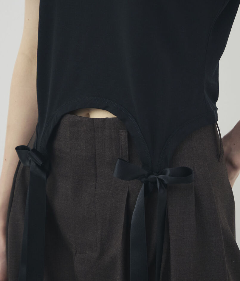 フロントに施された、長く垂れるサテンリボンがポイントです。