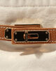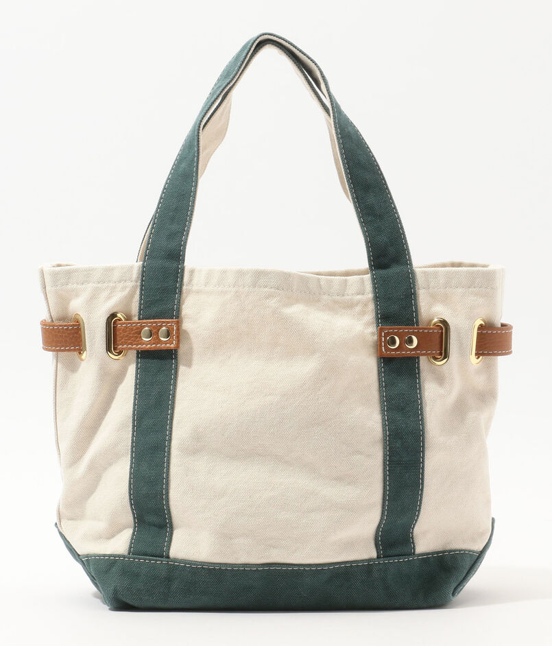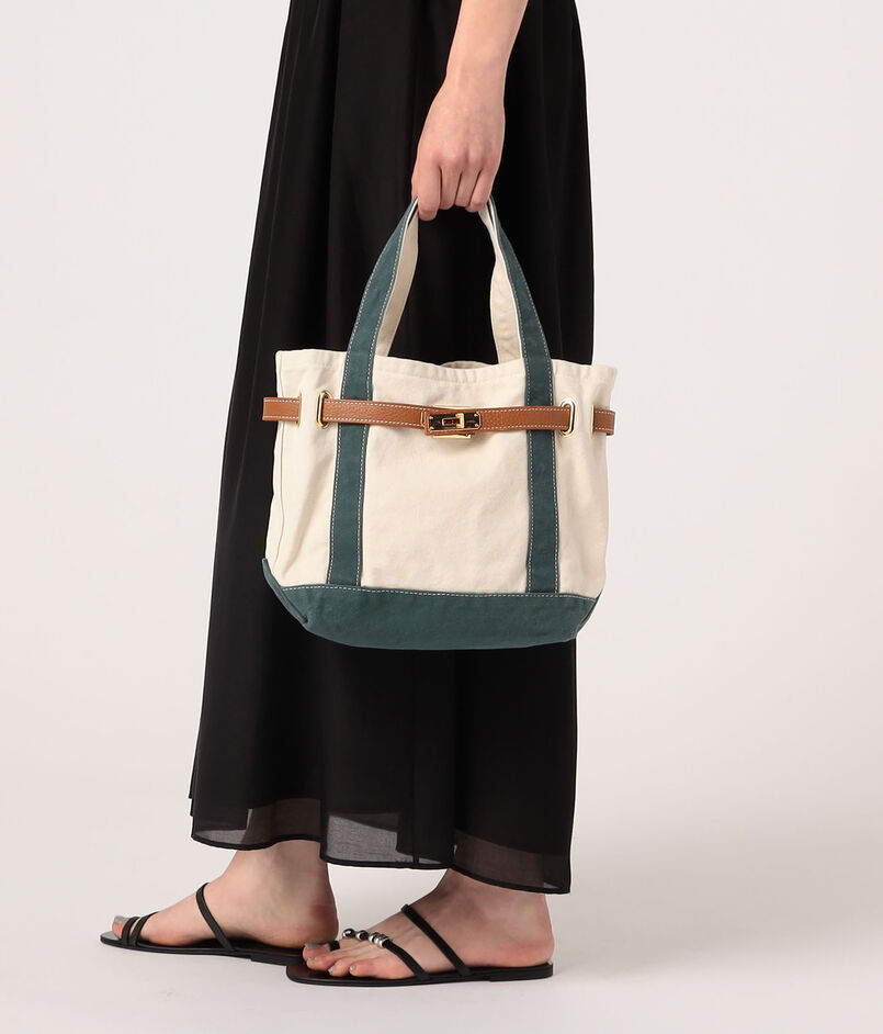 ヴィンテージ加工を施したコットンキャンバスに、シボ感のある上質な牛革ベルトと、ブランドの象徴であるゴールドのロックパーツが上品なアクセントを添えています。