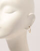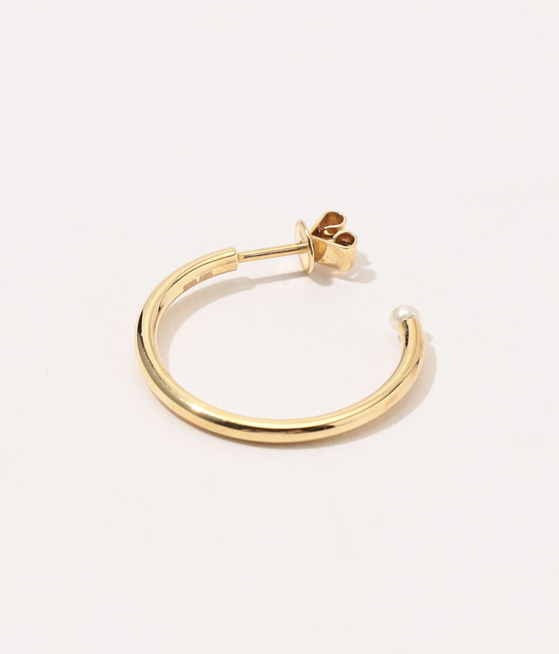 フープの先端には小さなパールを一粒あしらい、耳たぶの下で控えめに輝くアクセントに。