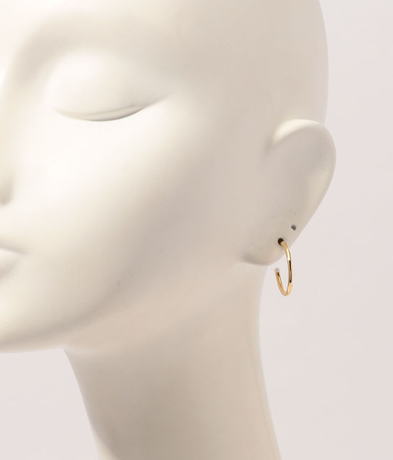 ゴールドの細いラインが円を描く、ミニマルで計算されたフープデザインのピアス。