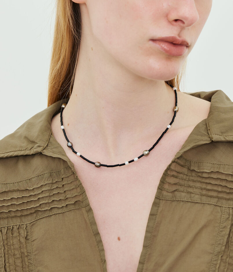 ウニを思わせる有機的なフォルムから着想を得たデザインは、不揃いな淡水パールと滑らかなビーズのコントラストが印象的。