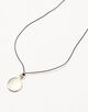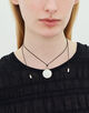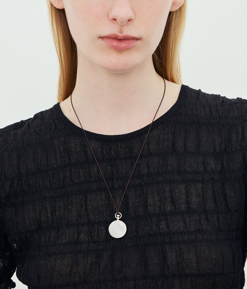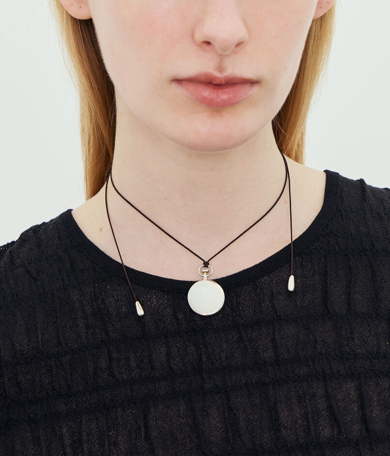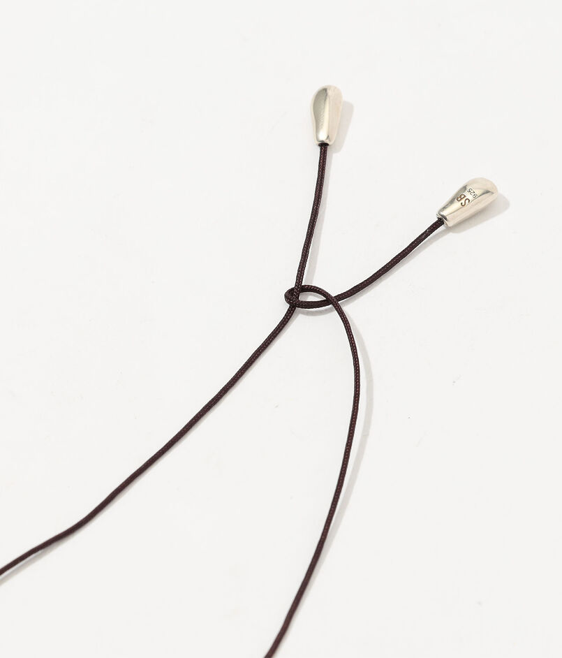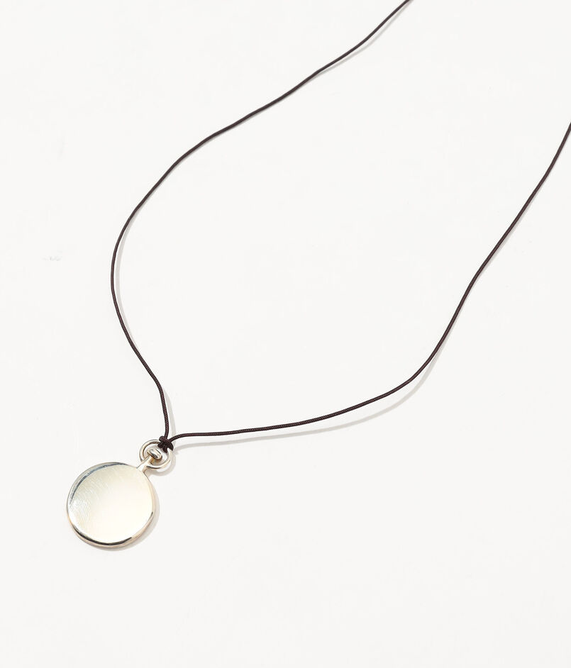 モダンなシルバーペンダントトップを、サテンコードにあしらったネックレス。