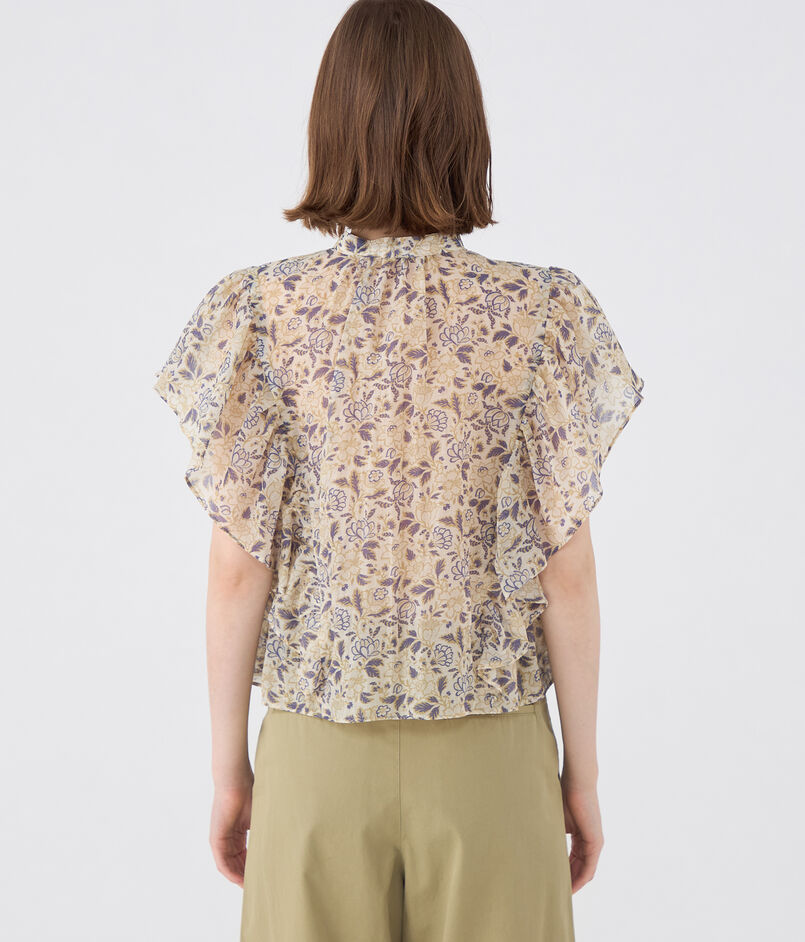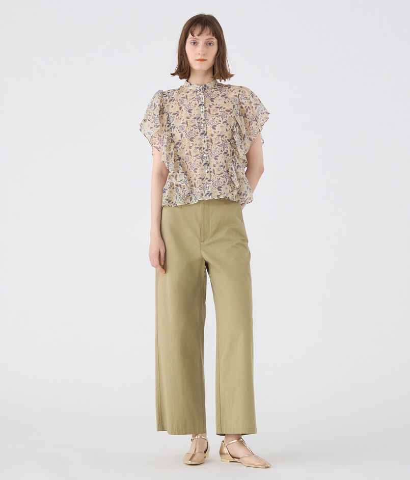 バタフライスリーブブラウスはすっきりとしたスタンドカラーと大胆なスリーブデザインでフェミニンかつクラシカルな印象に仕上げた一枚。