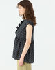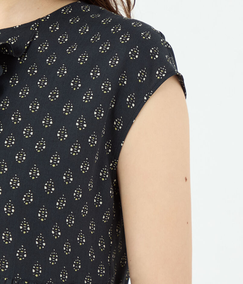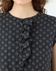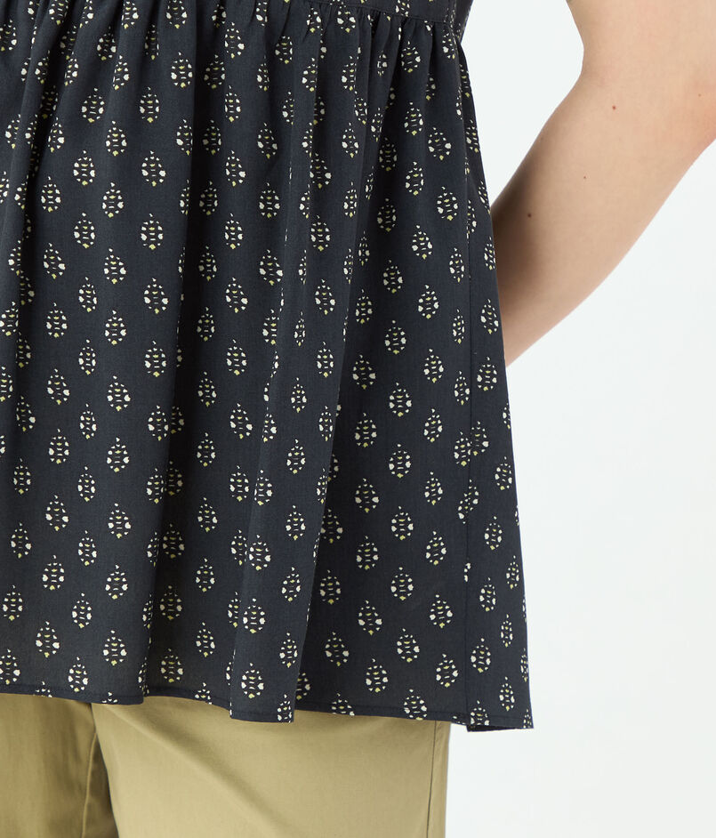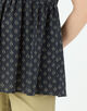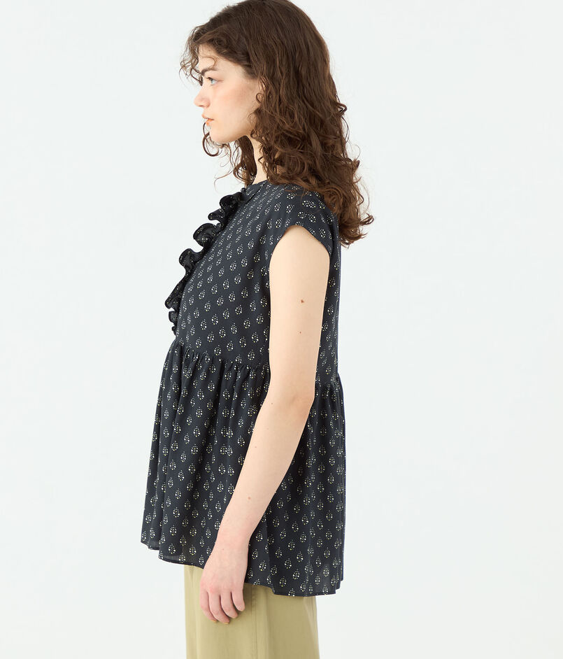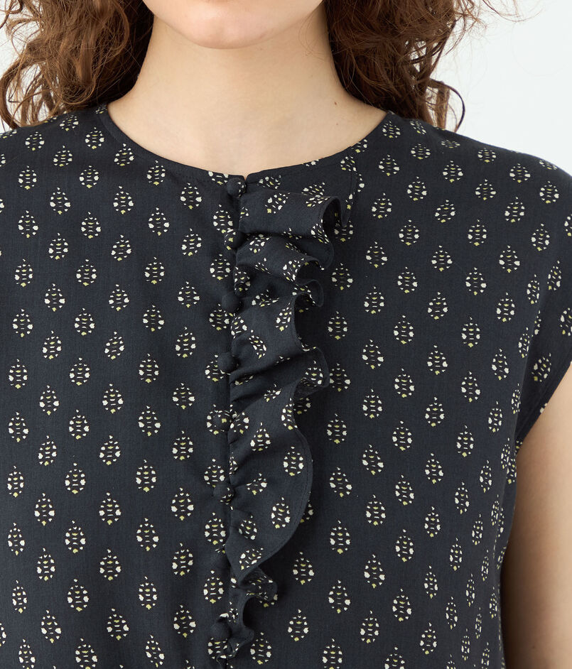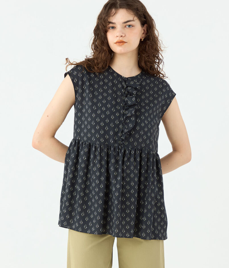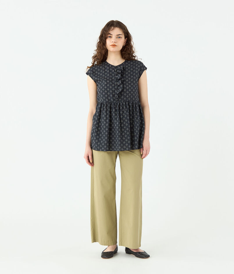 総柄ながらも落ち着いた配色にすることで取り入れやすいアイテムに仕上がっています。肩先を包み込むようなスリーブデザインと胸下に寄せたギャザーにより生まれるふんわりとしたシルエットで女性らしい着こなしが決まるブラウス。