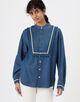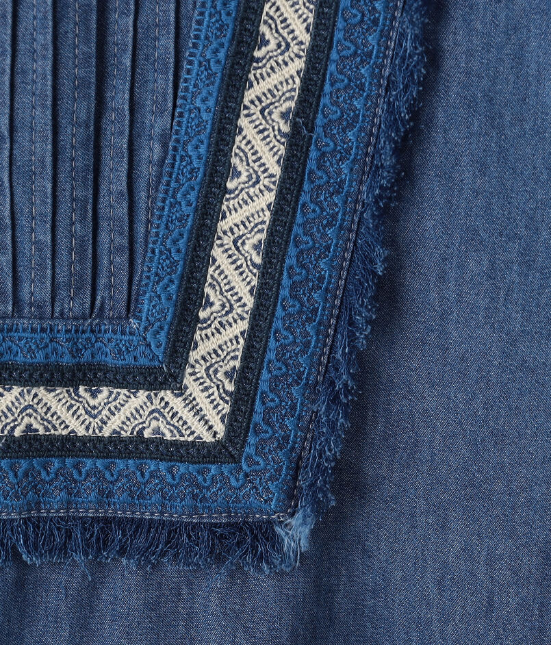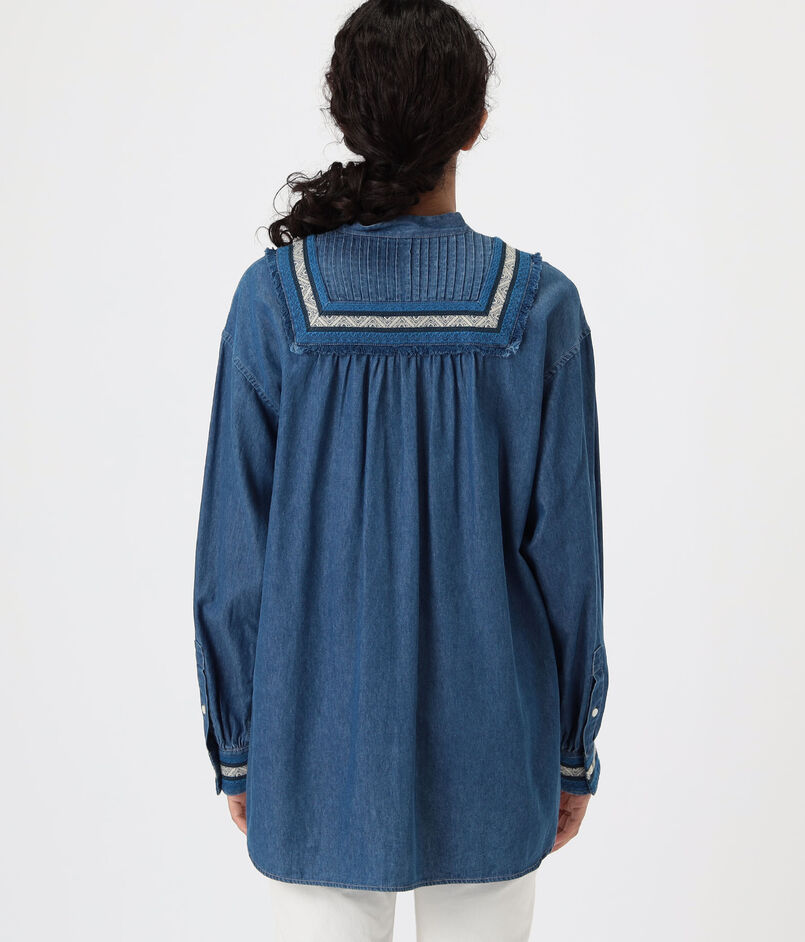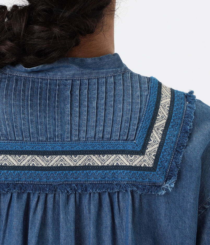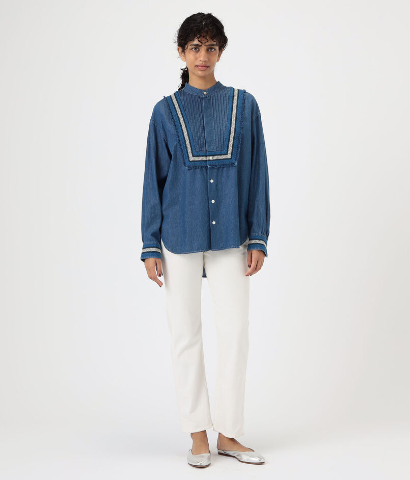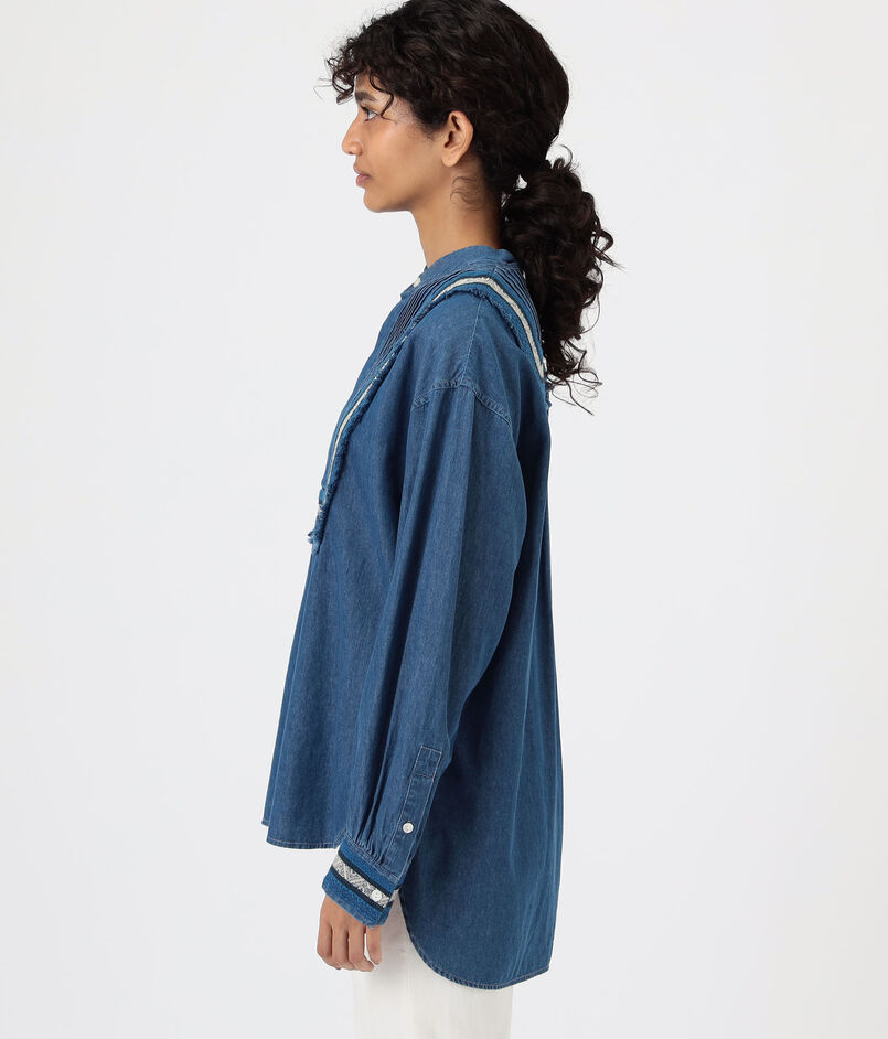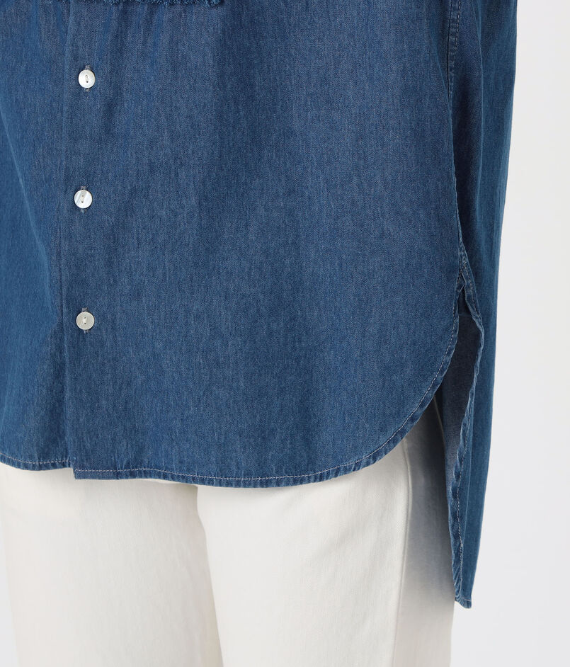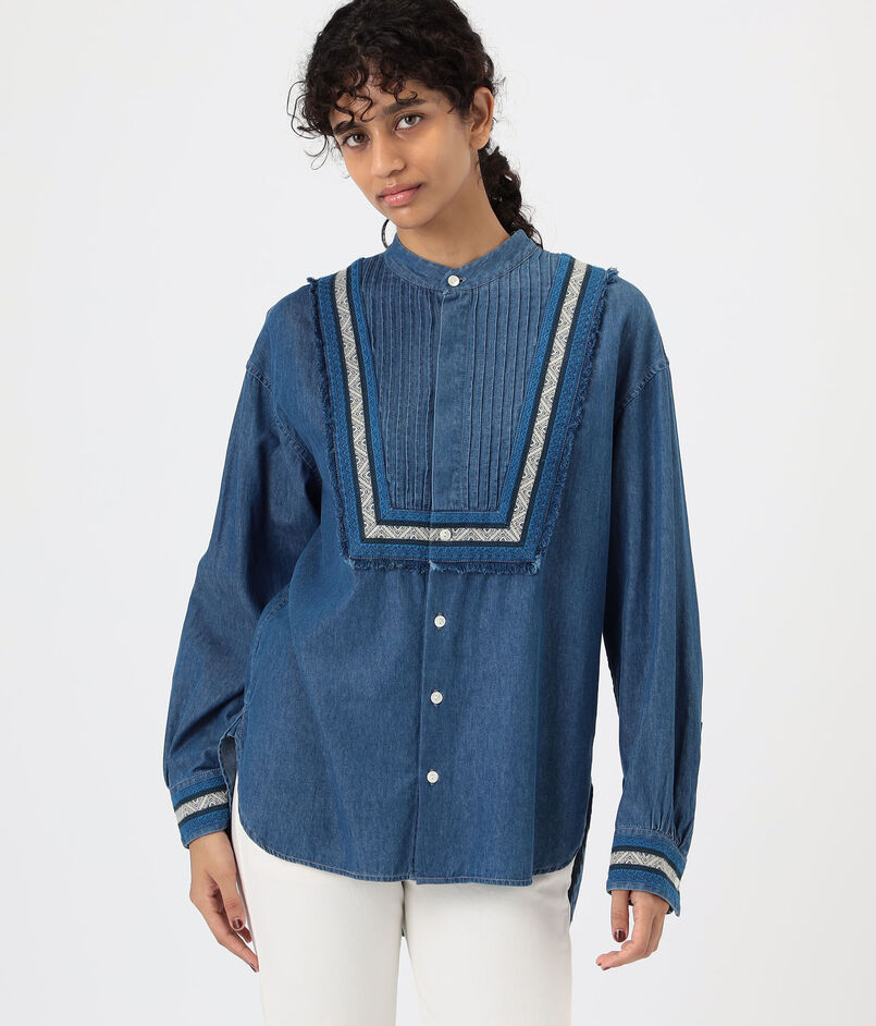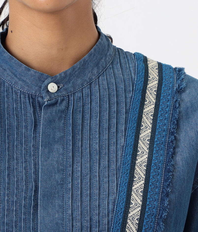 共地をほどいたフリンジに前後のピンタックディテールがデザインポイントのシャツ。