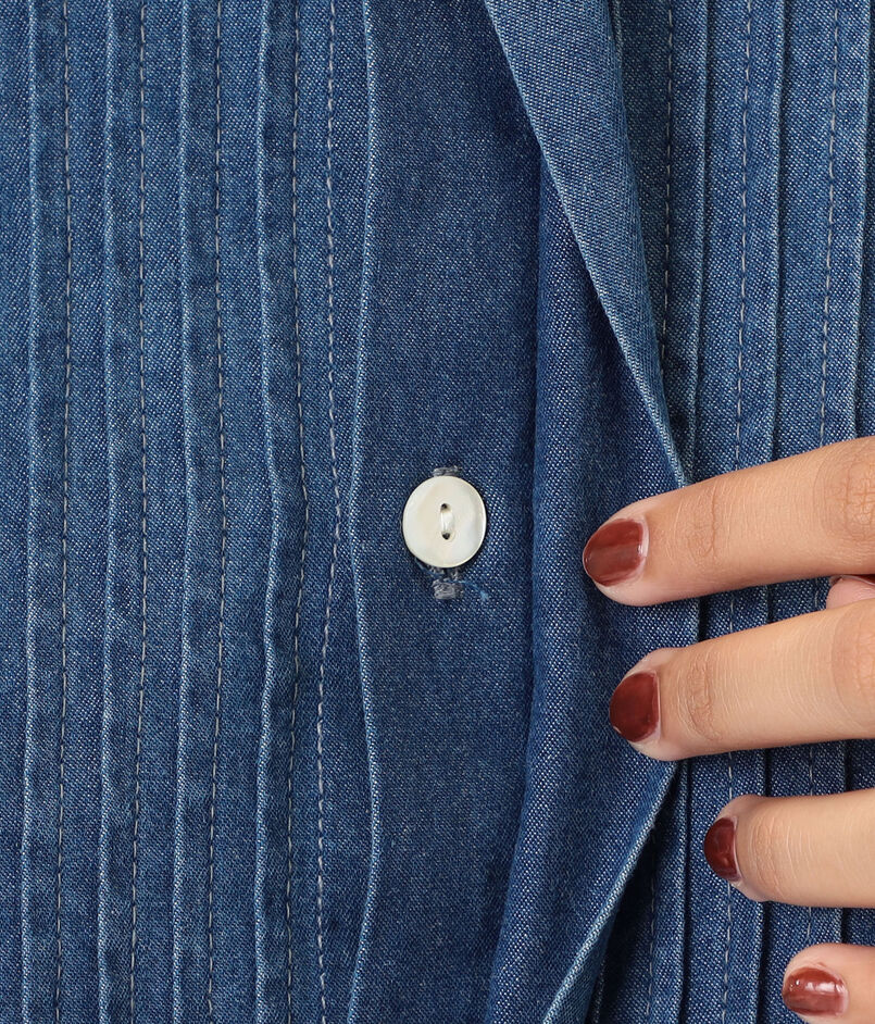 共地をほどいたフリンジに前後のピンタックディテールがデザインポイントのシャツ。