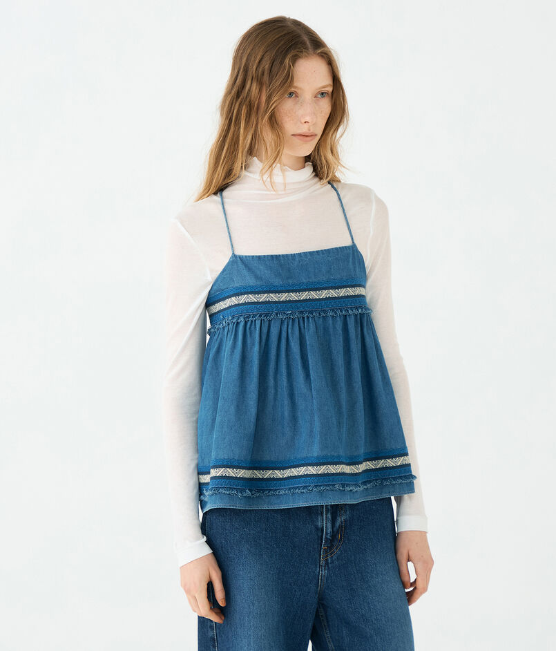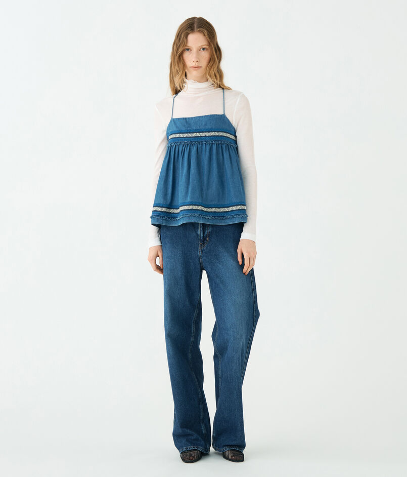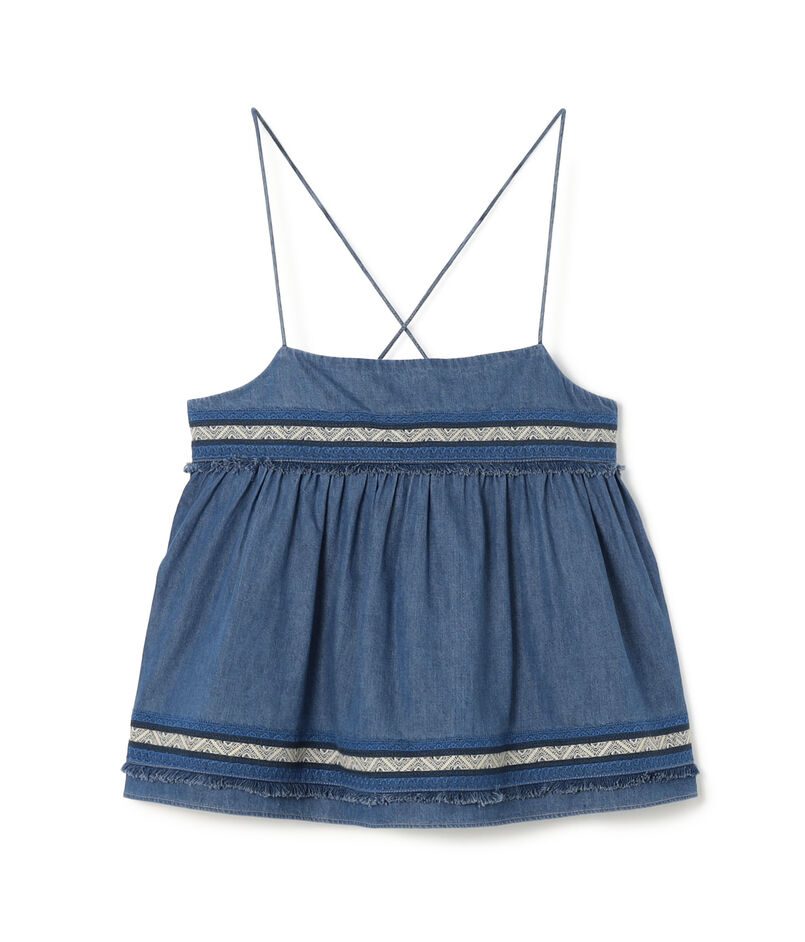 キャミソールは華奢なストラップと胸下にたっぷりとギャザーを寄せたペプラムシルエットでキュートな印象の一枚。