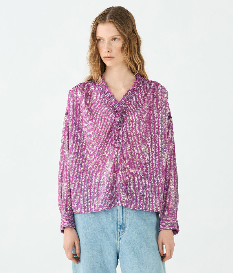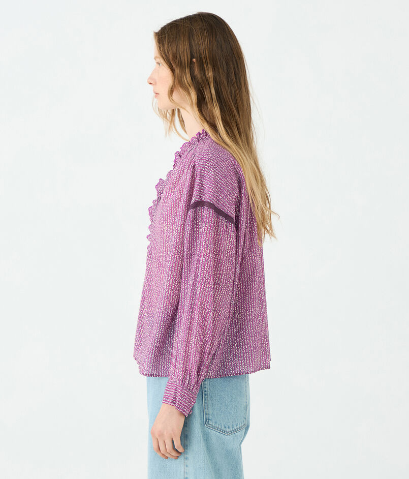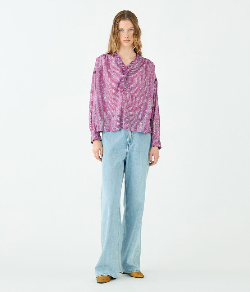フェミニンなフリルネックながら、Vネックデザインにすることでほど良くシャープさをプラスしたスタンドフリルブラウス。