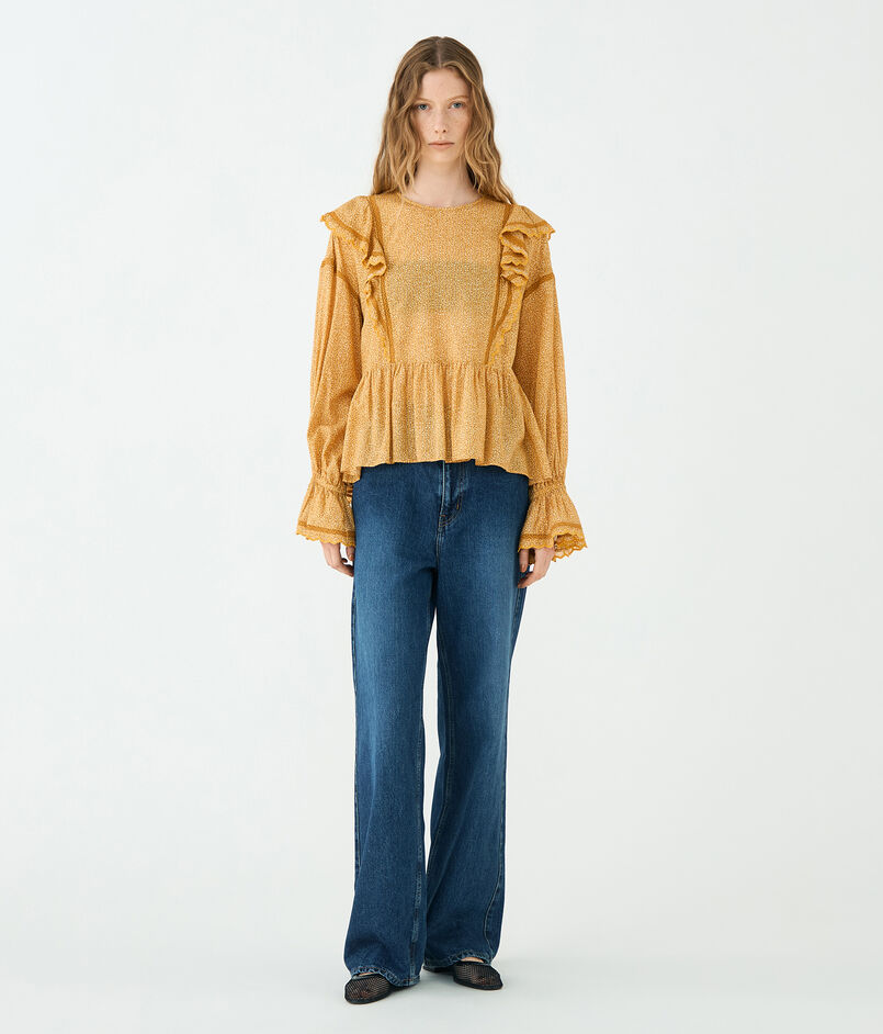 胸下から広がるペプラムシルエットでウエスト位置が高く見え、ボリュームがありつつもすっきりとしたバランスでお召しいただけます。