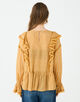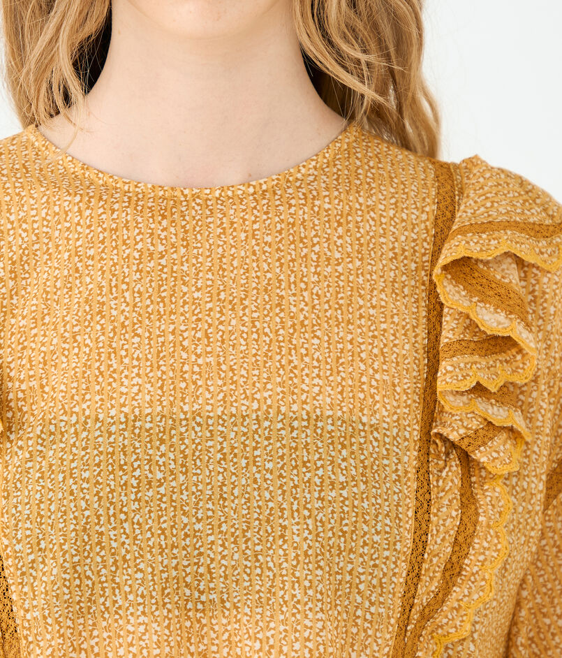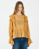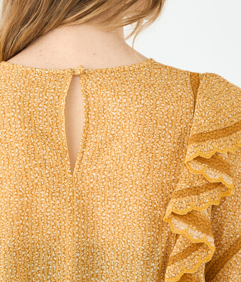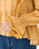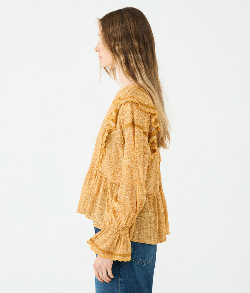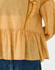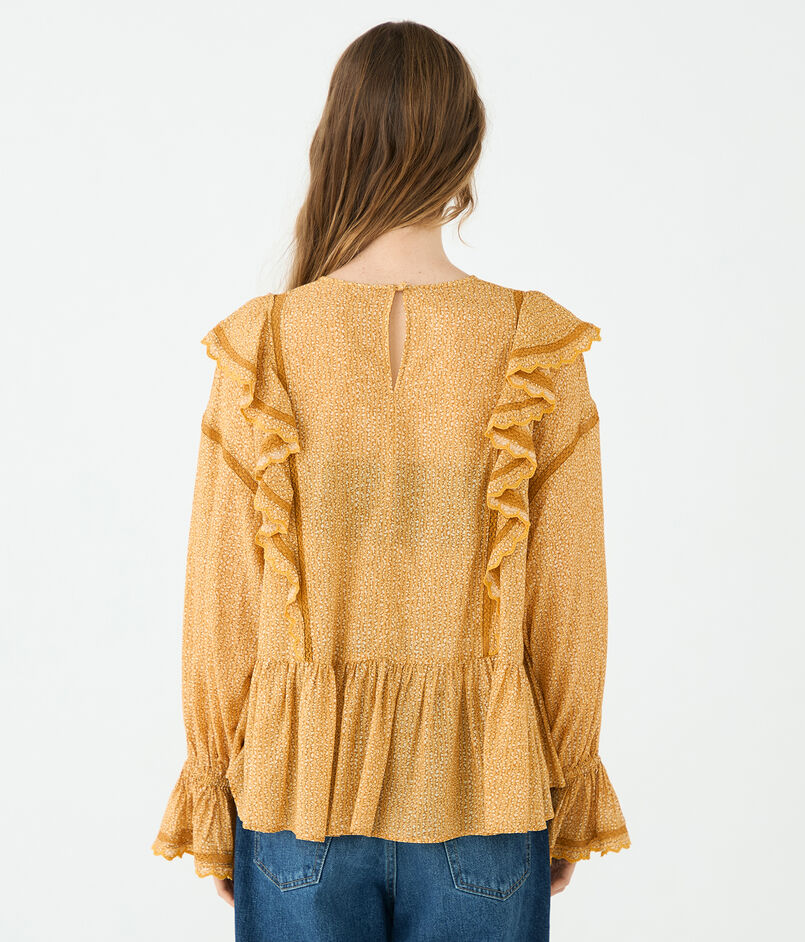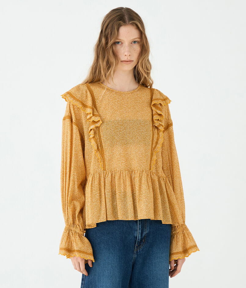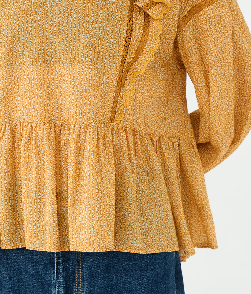 レースと切り替えを利用したギャザーを絶妙にミックスしたフェミニンなデザインのペプラムレースブラウス。