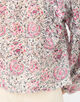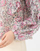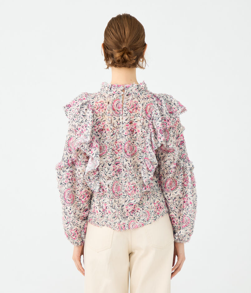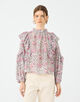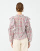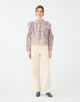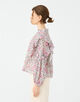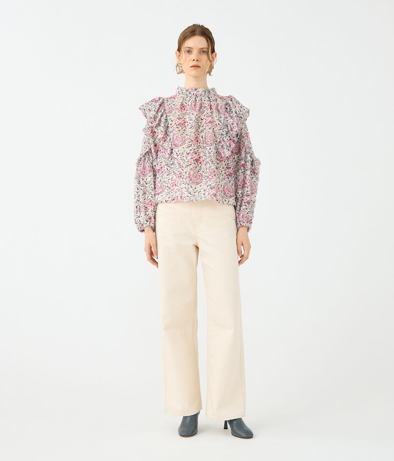 ブラウスは襟元のギャザーやアームホールとスリーブのフリルディテールでフェミニンな印象の一枚。