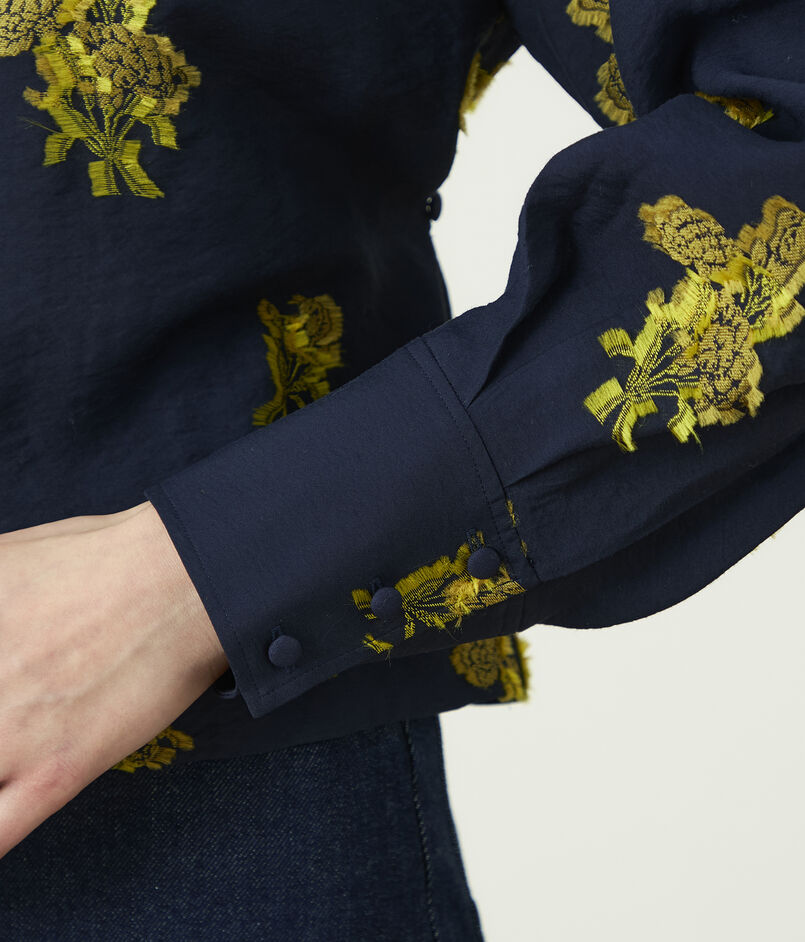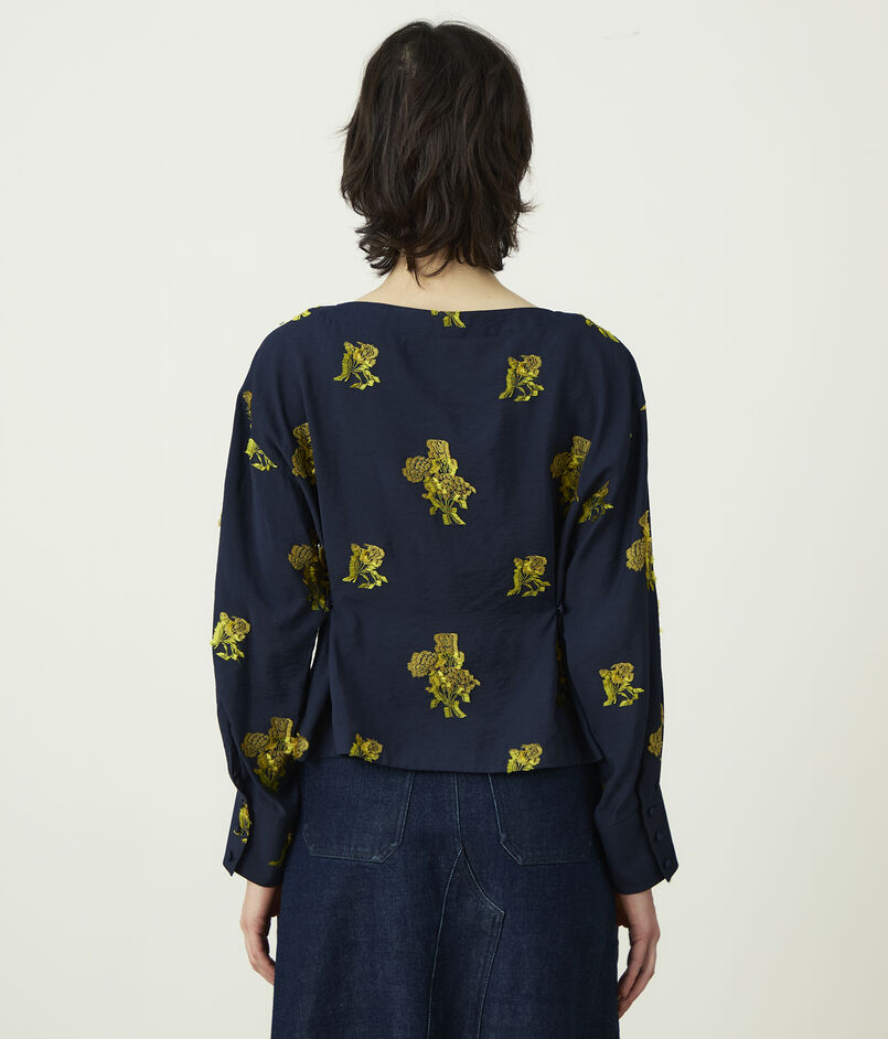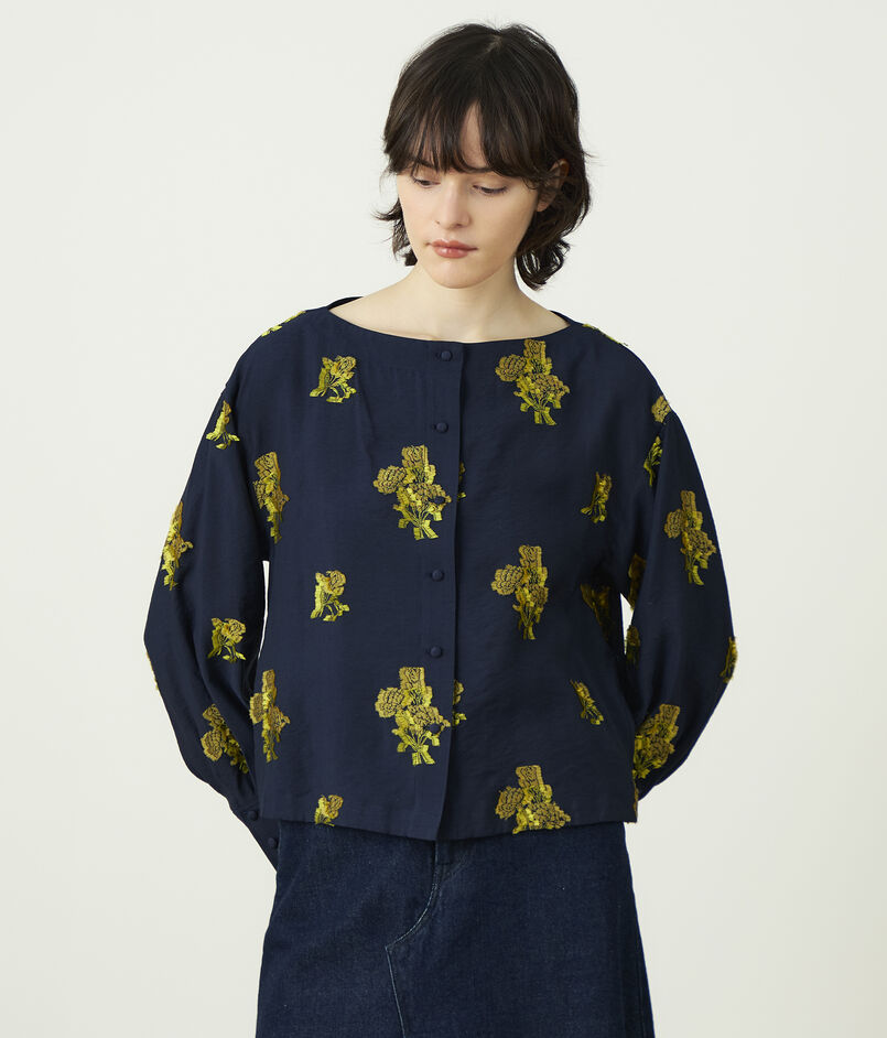 カフスのボリューム感がデザインポイントのシンプルな前開きのボートネックブラウス。