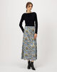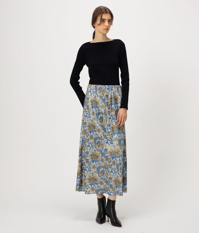 スカートは生地をバイアス取りすることで身体に沿ってきれいなドレープが生まれ、動きのあるシルエットに仕上げた一着。
