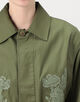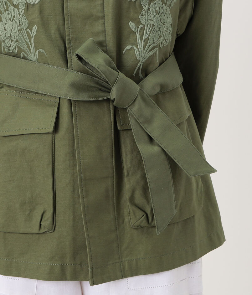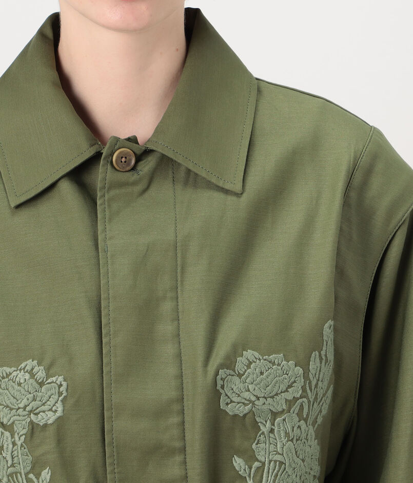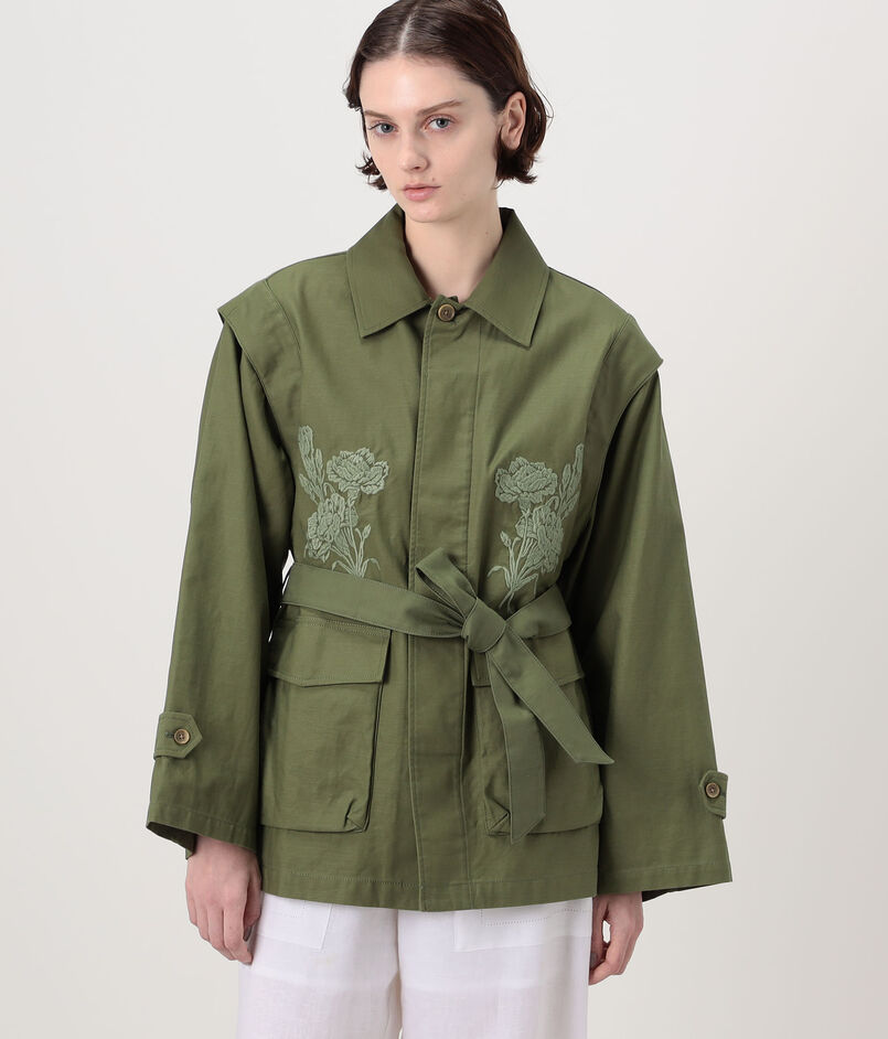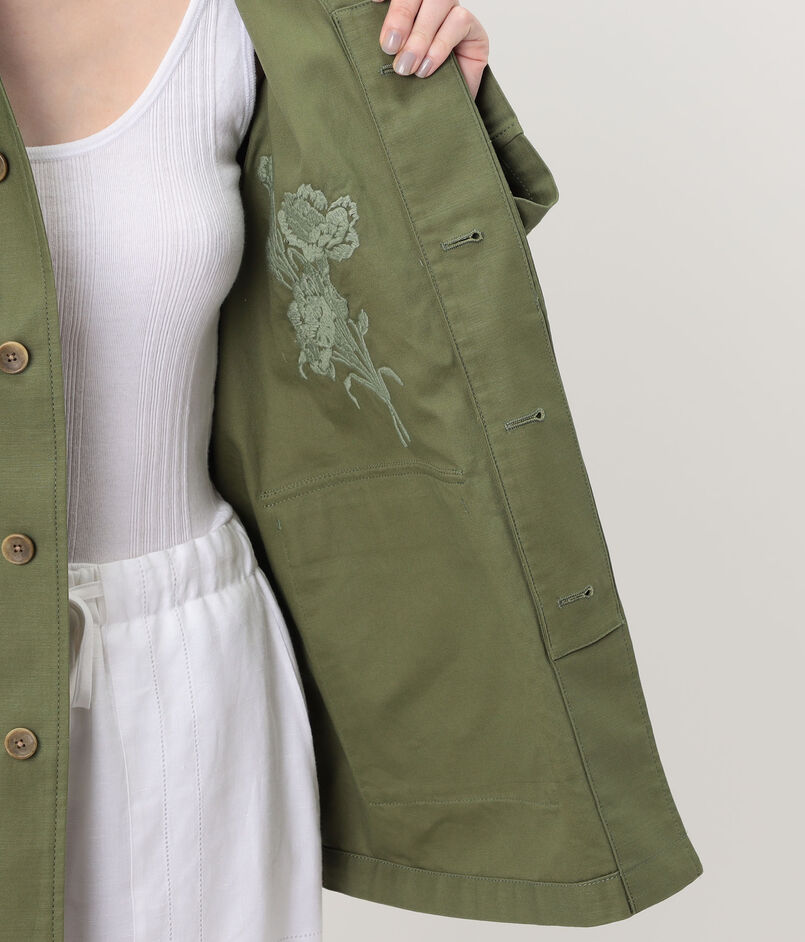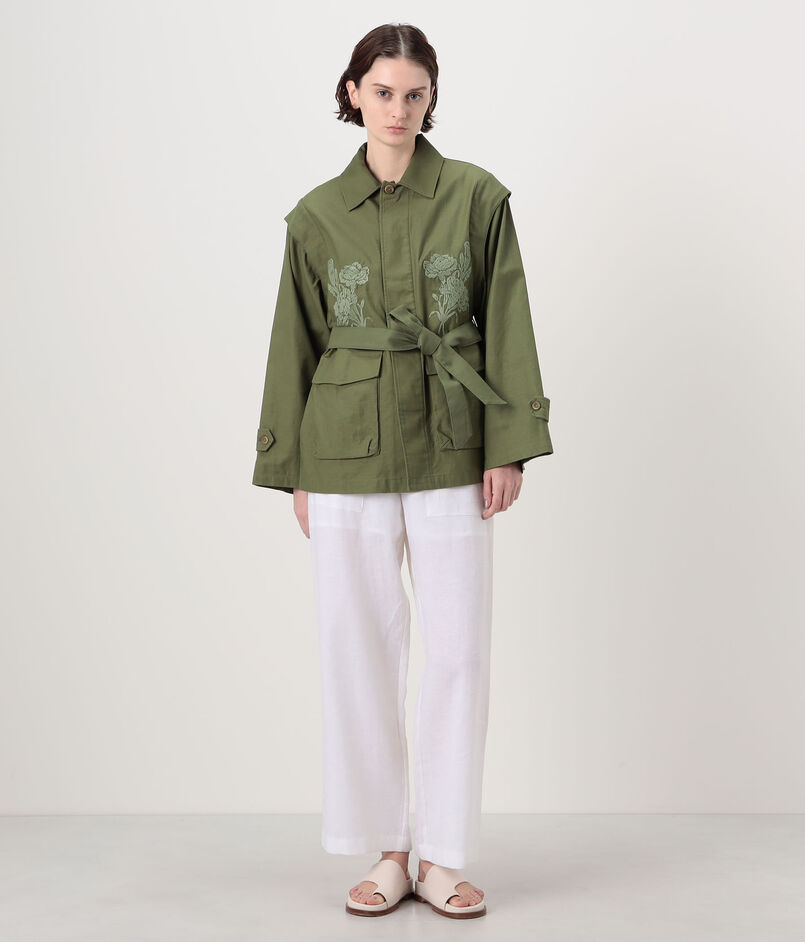 スラブ感のあるコットン糸で織り上げた、適度なハリとほのかな光沢感が特徴のバックサテン素材に〈SOULEIADO〉らしいフラワーモチーフの刺繍を施したジャケット。