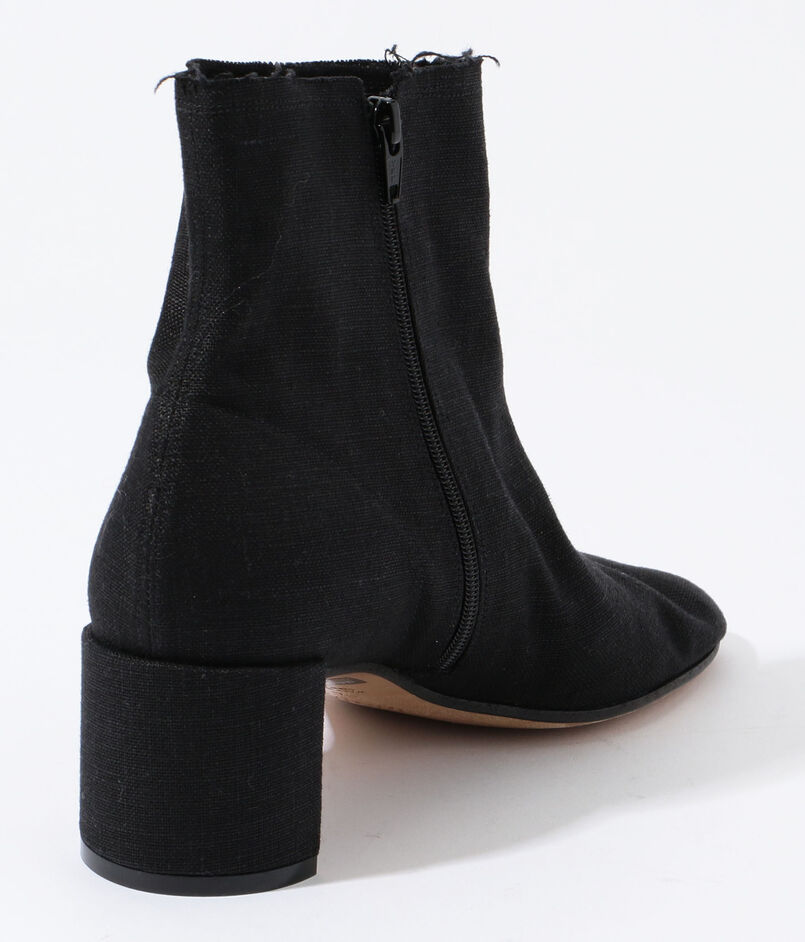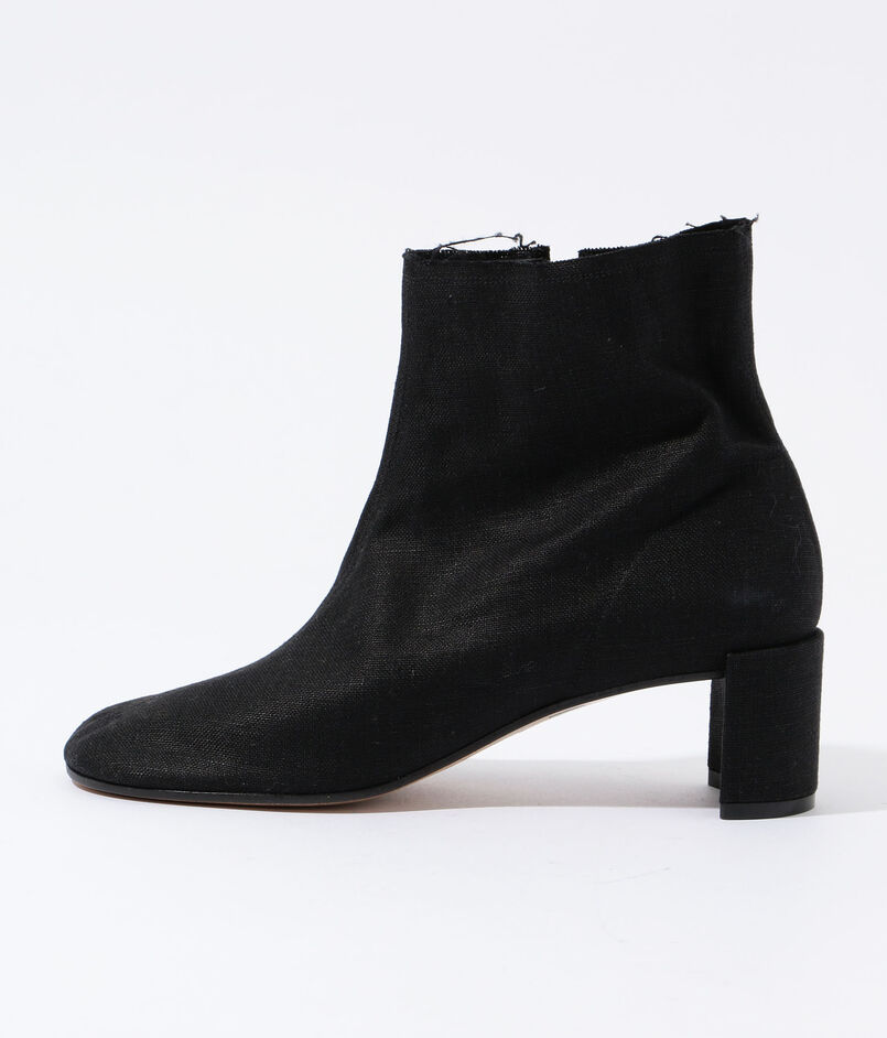ラフィア素材、断ち切りのデザインが印象を軽くしてくれるアンクルブーツ。