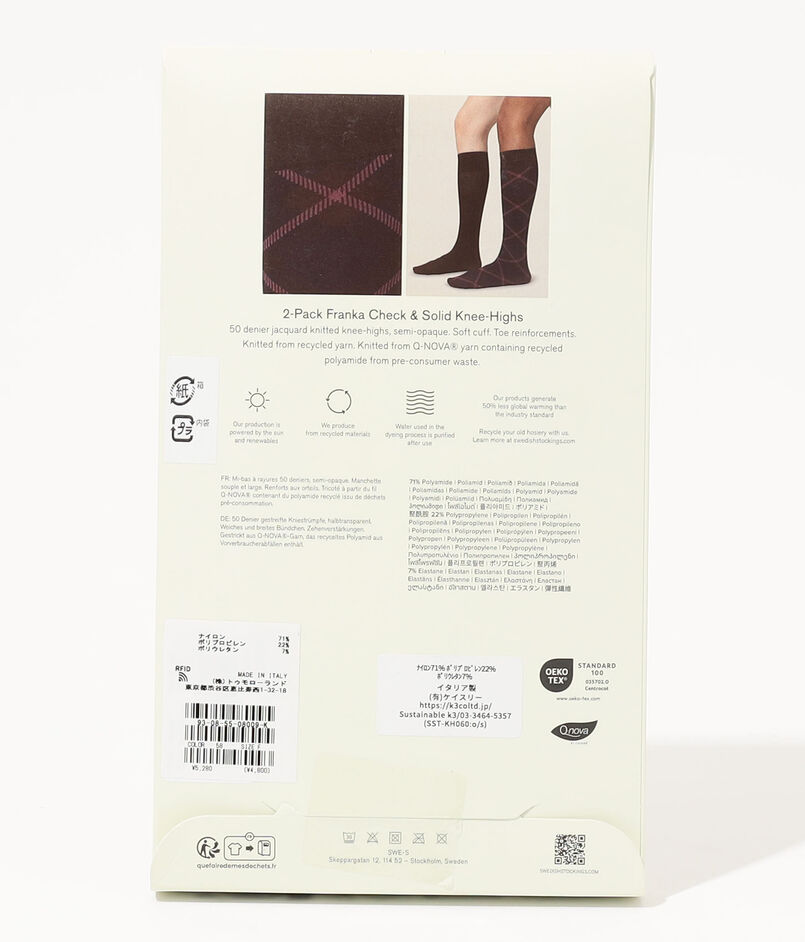 50デニールのリサイクル糸を使用した、ソリッドカラーとジャカードチェック柄の2足セットのニーハイソックス。