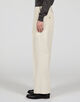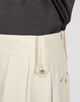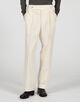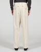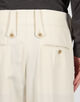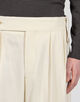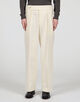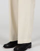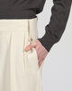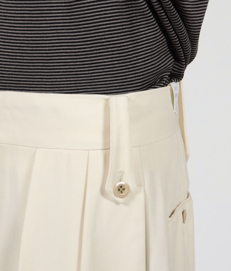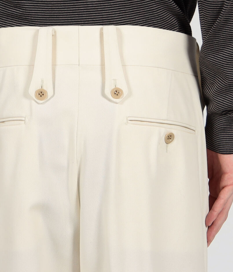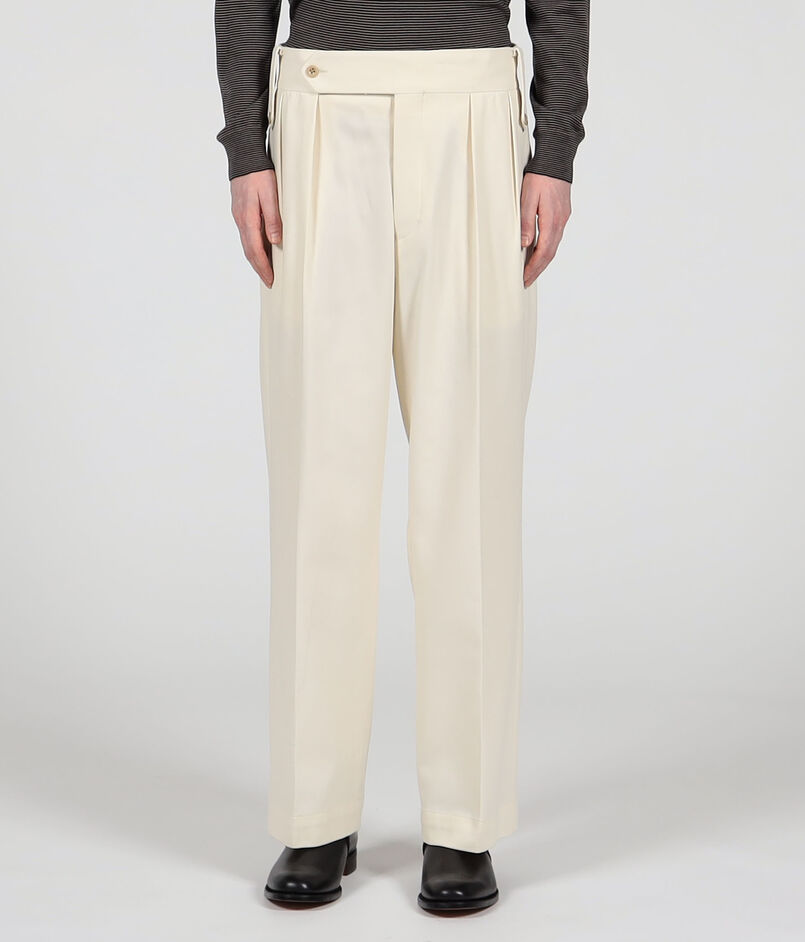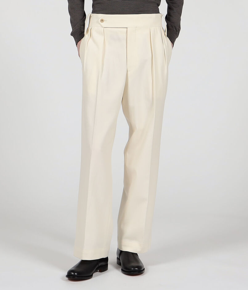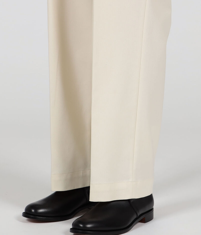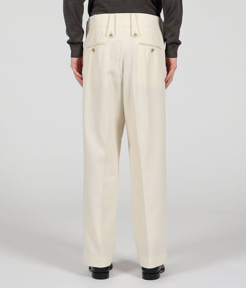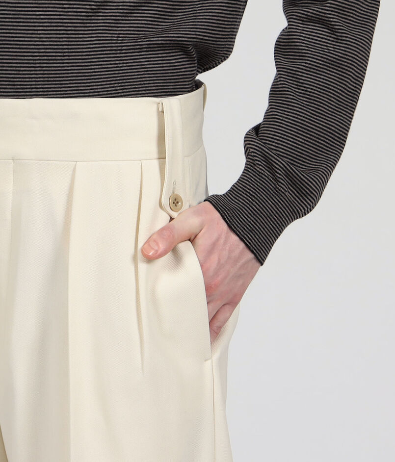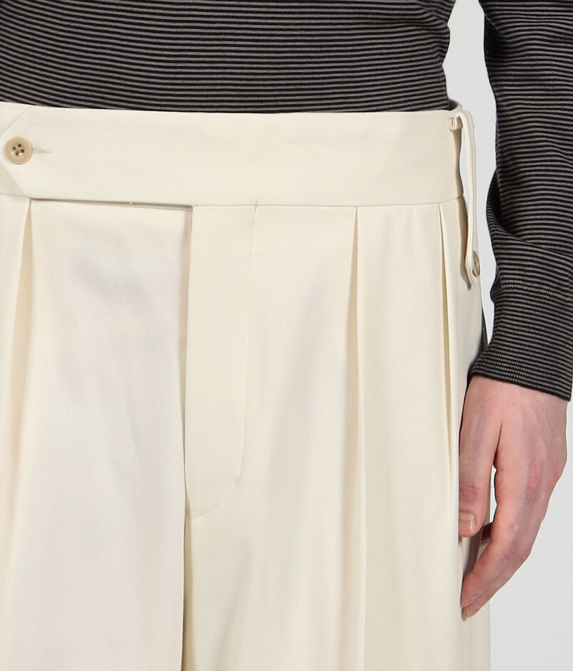 テイラードパンツで使用されるプリーツ入りのマーベルトと、芯地を使用し吸いつくような腰回りの着心地を実現し、ワタリから裾にかけてストレートでワイドなシルエットのパンツです。