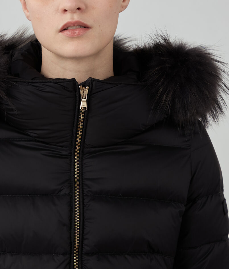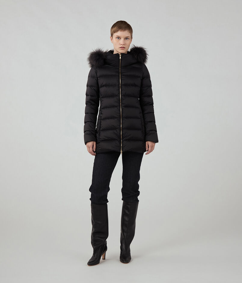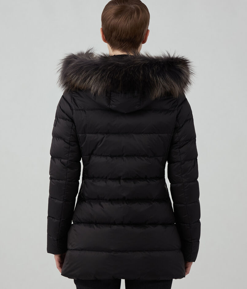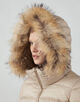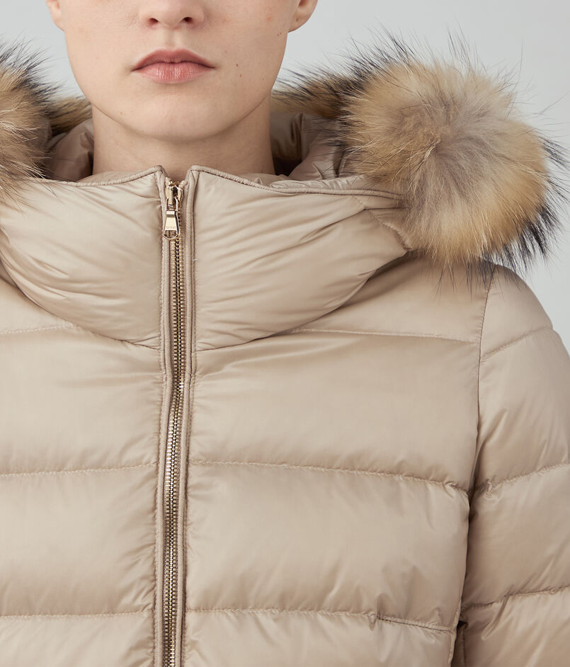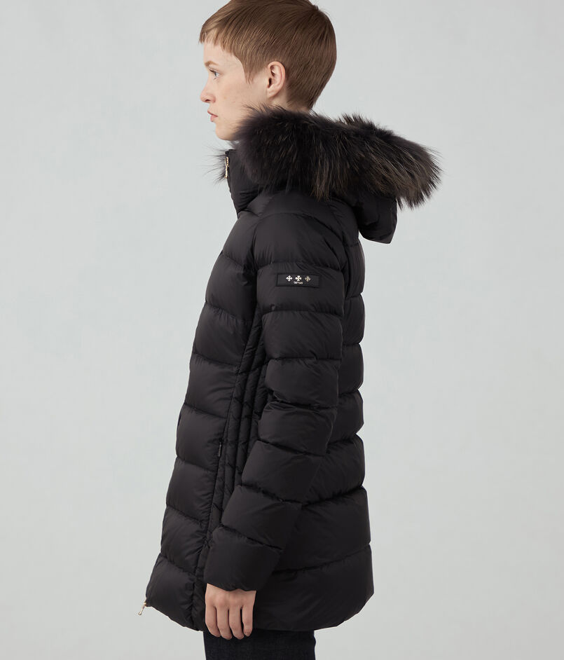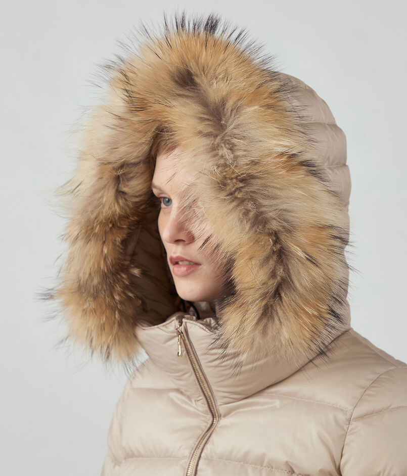 顔周りは防寒できるようフードを付けたデザインにし、華やかな印象の衿周りのファーは取り外し可能。