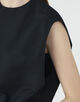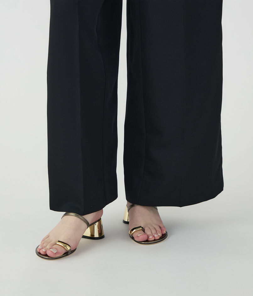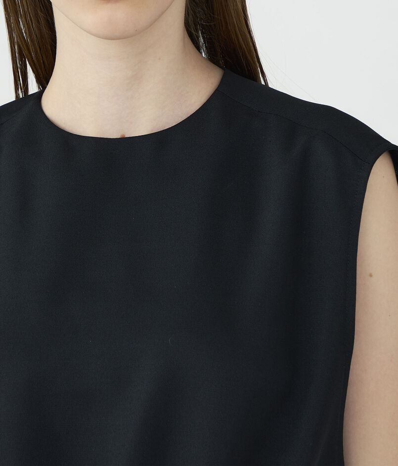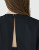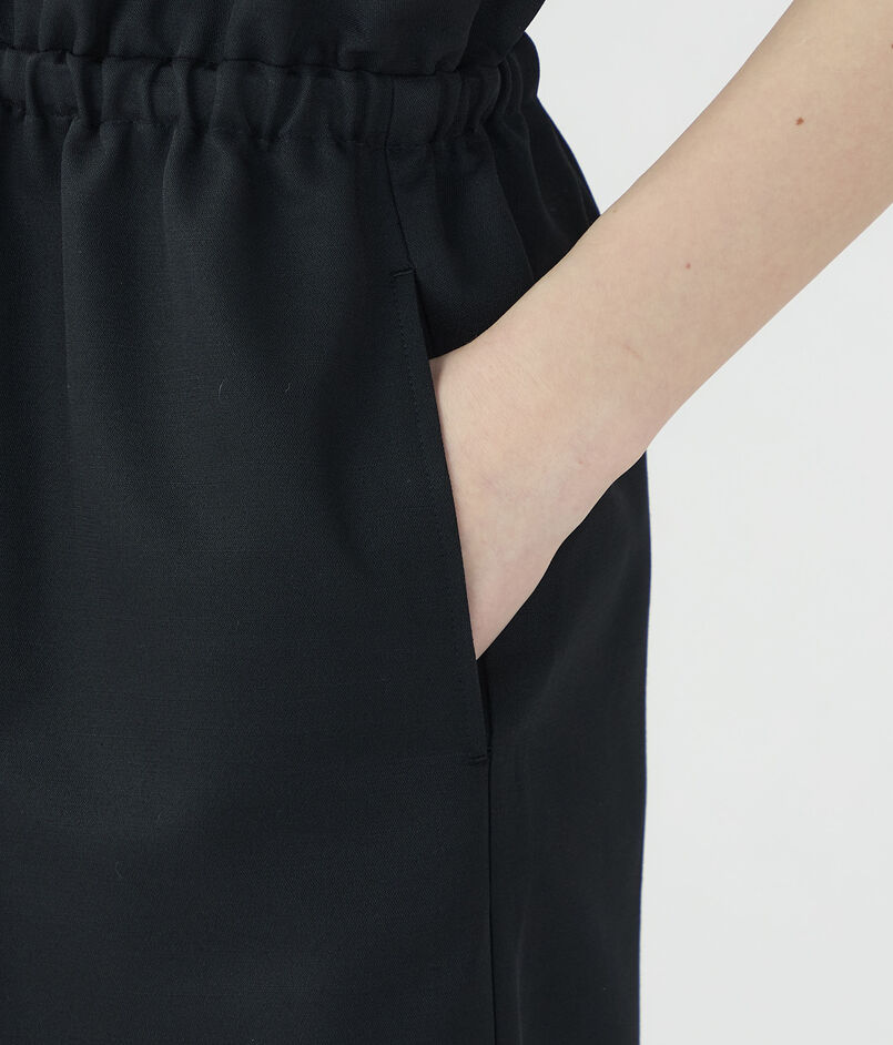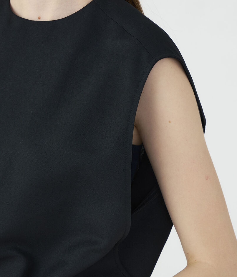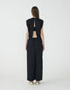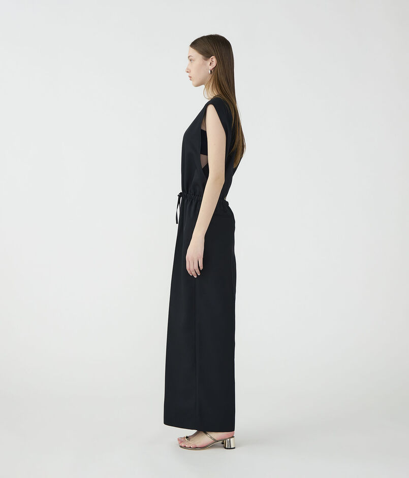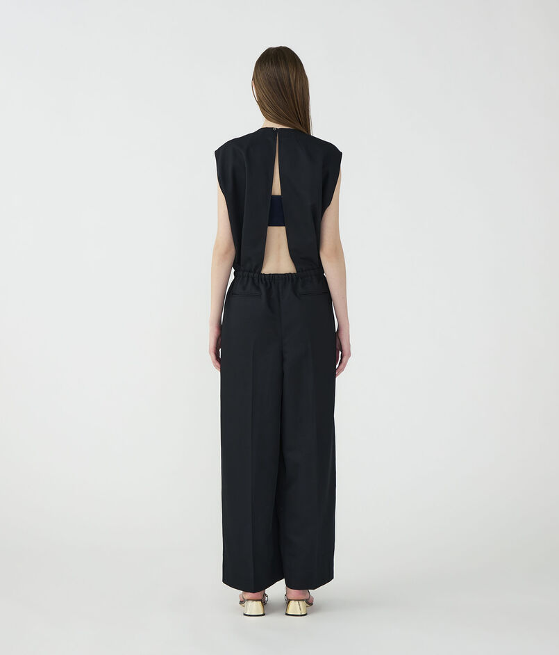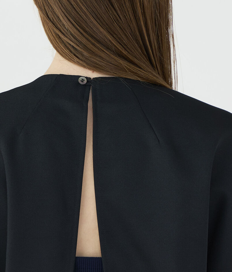 漆黒のようなカラーに視線を惹きつけるバックスタイル、どの角度から見ても品のあるシルエットで、仕立ての良さが映える一着。