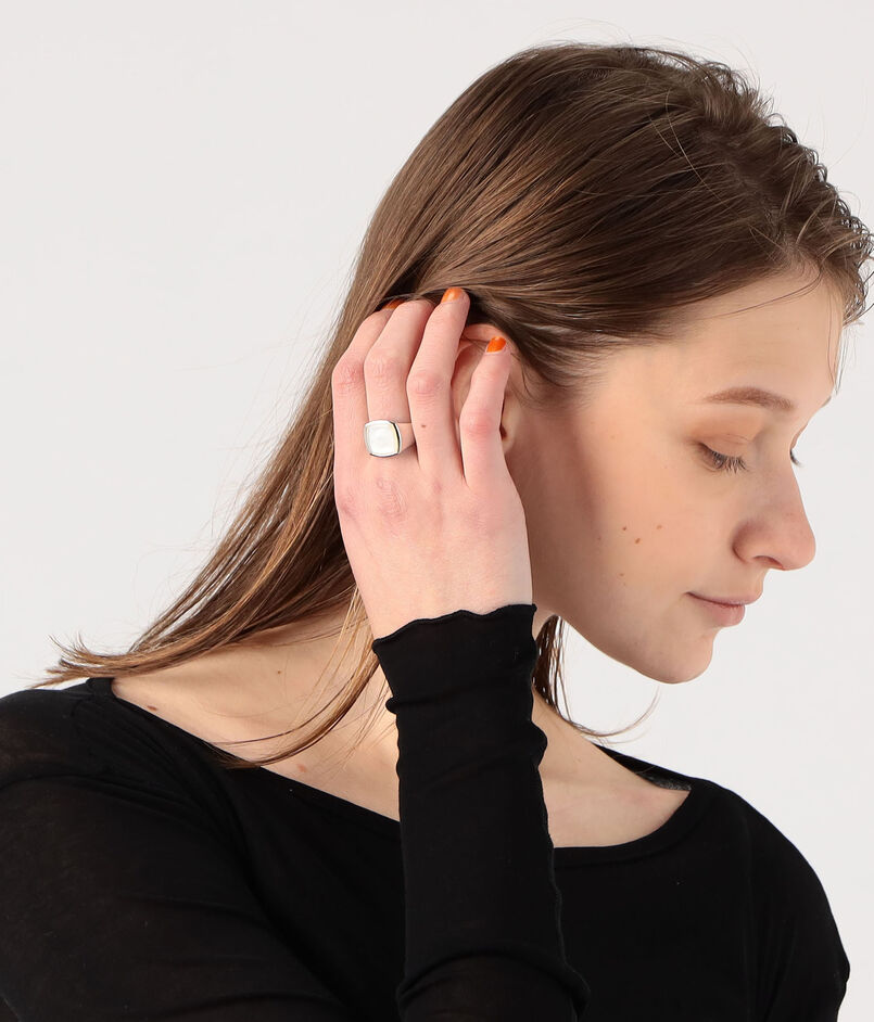 美しく磨き上げられたスターリングシルバー925のリングは表面を強化し変色を防ぐために、ホワイトロジウムでコーティングされています。