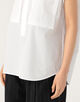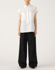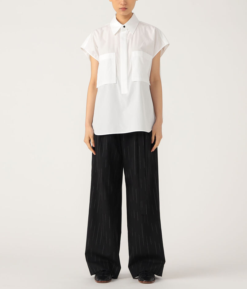 ハリのある素材感なので、とろみのあるパンツや細身のパンツとのスタイリングもおすすめ。