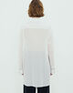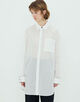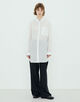 レギュラーカラーのロングシャツは、細身のボディーバランスでモダンさを表現。