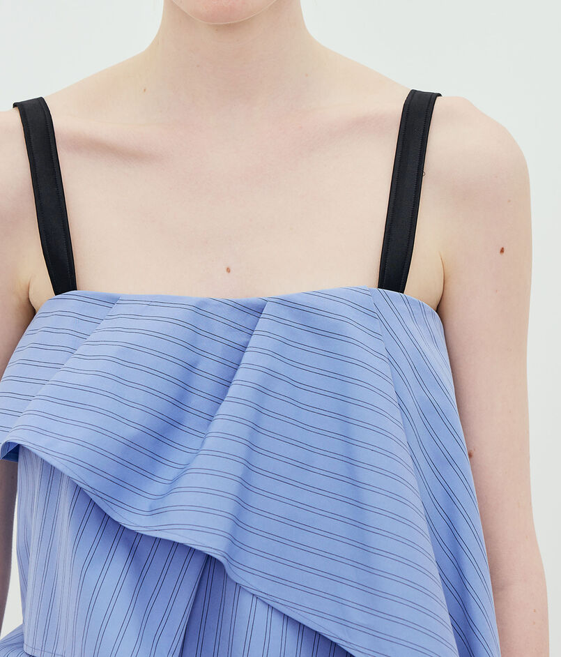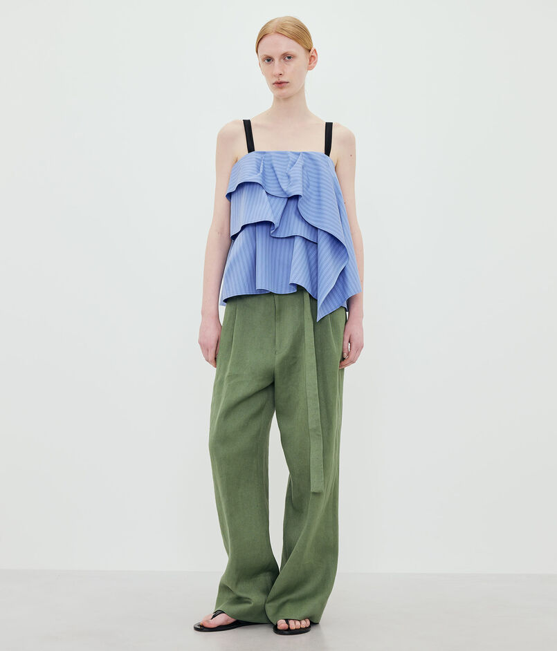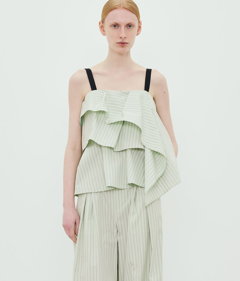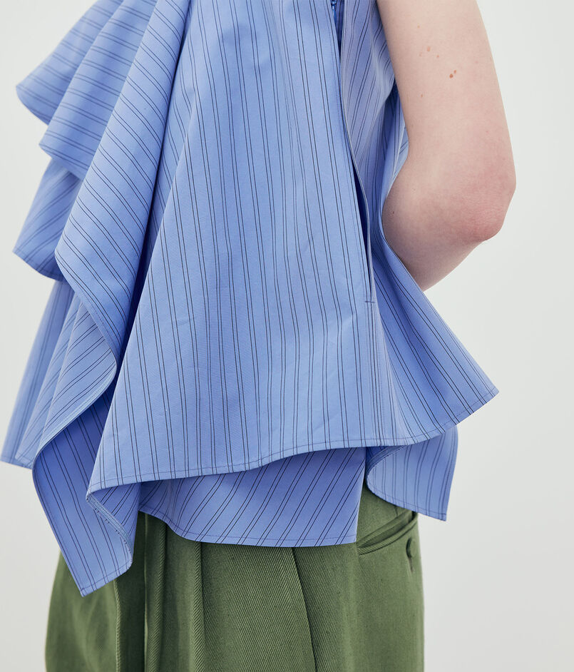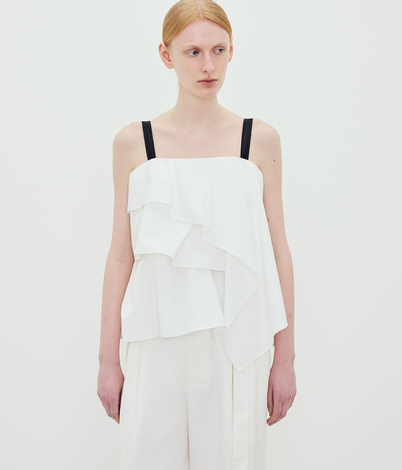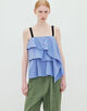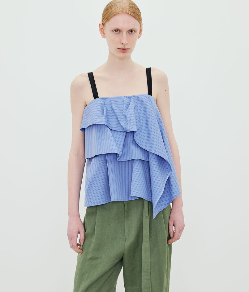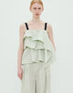 生地の地の目やタックの方向を工夫し、立体感のあるラッフルティアードデザインに仕上げたトップス。