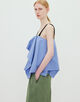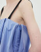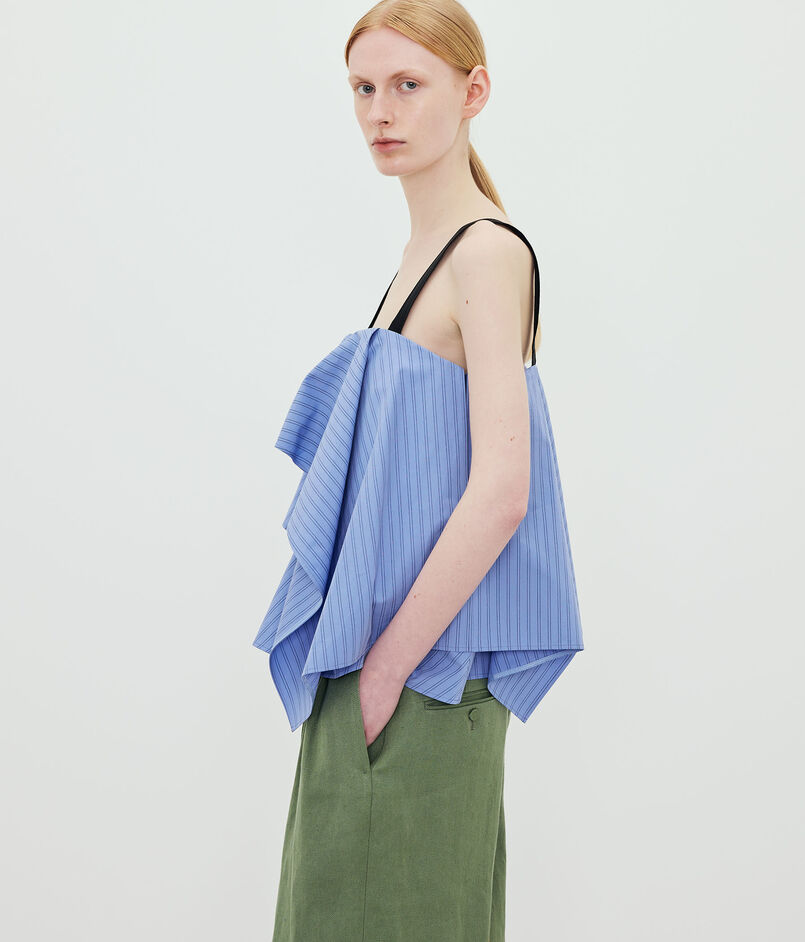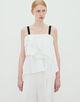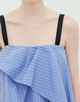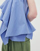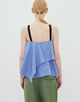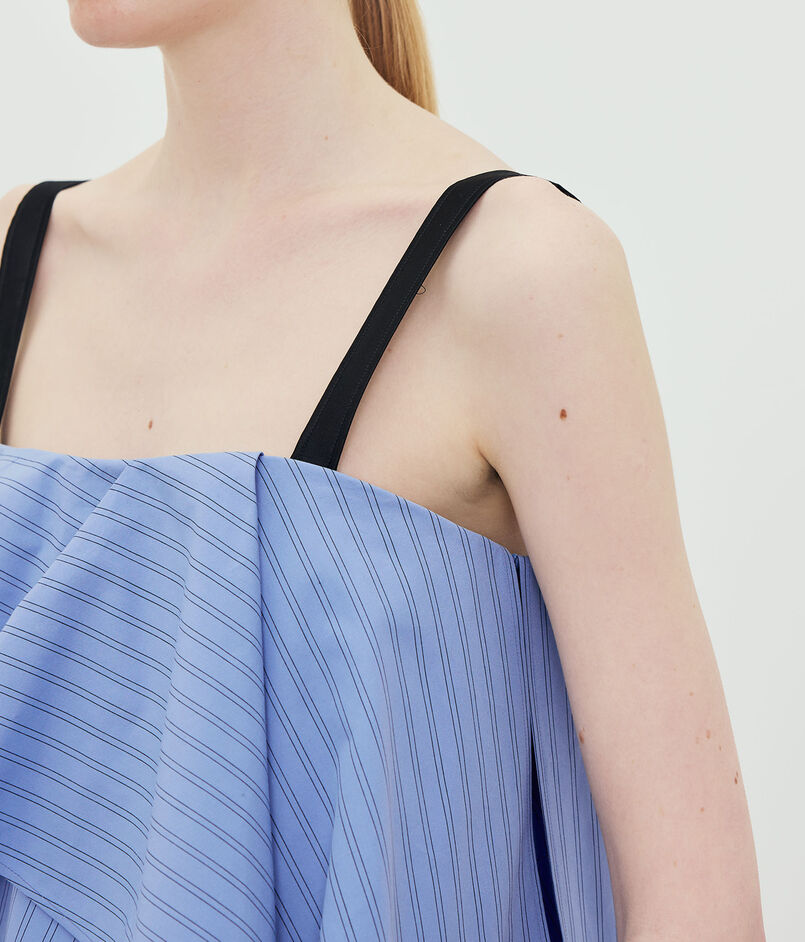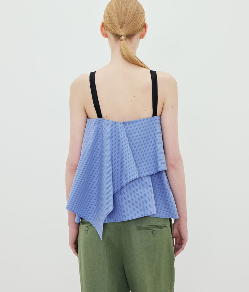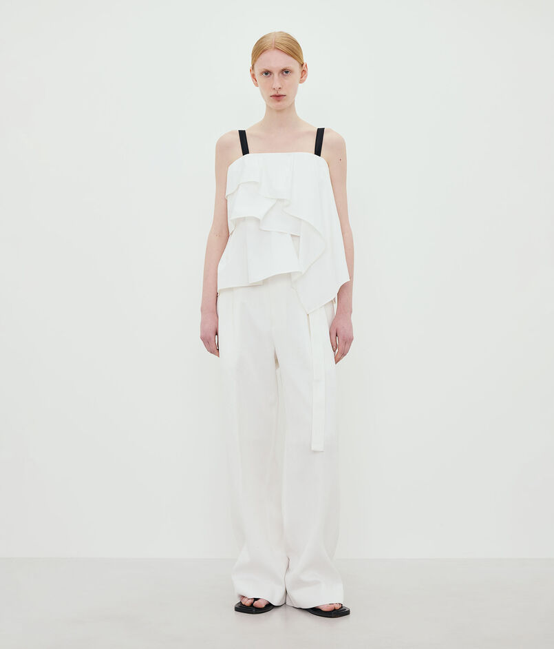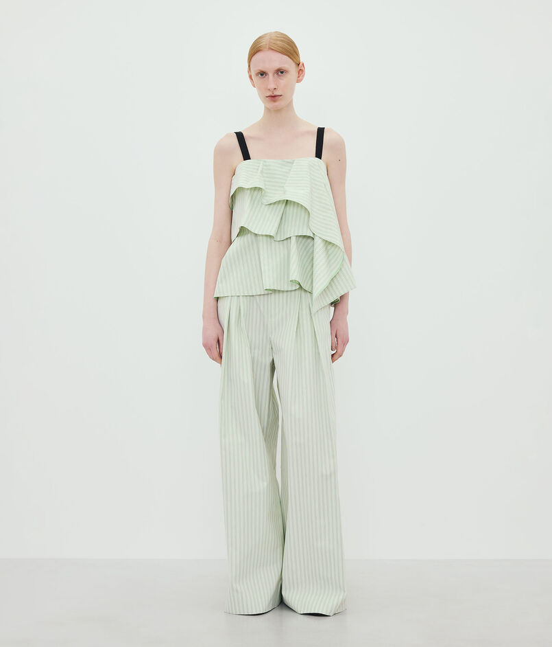 生地の地の目やタックの方向を工夫し、立体感のあるラッフルティアードデザインに仕上げたトップス。