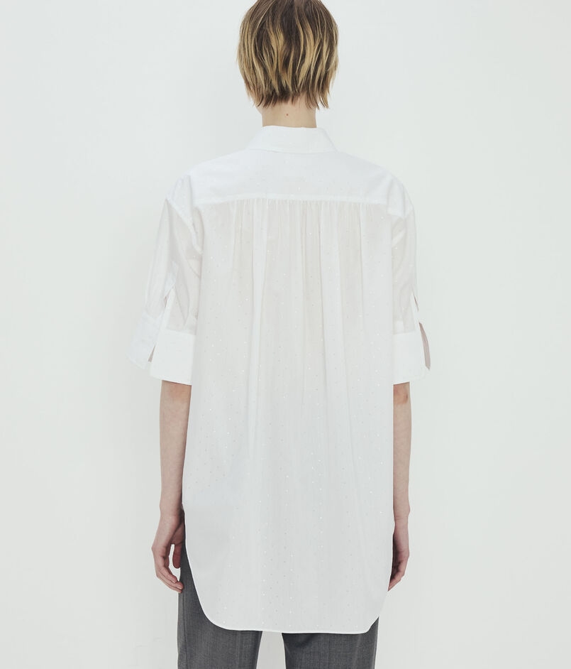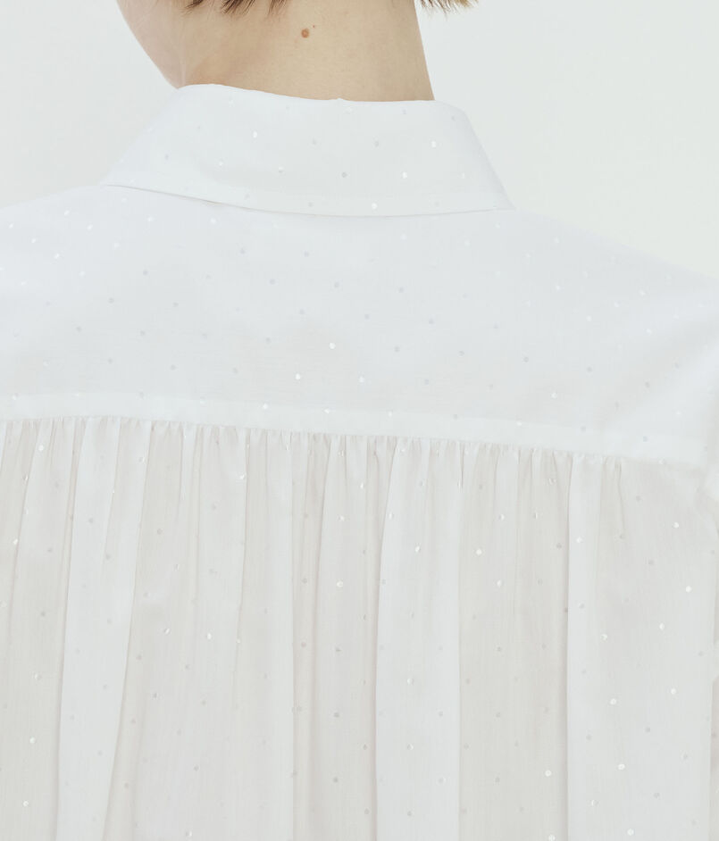 ゆとりのあるボディーデザインでリラックス感もありつつ、美しい仕立てに加えバックヨークのギャザーの美しさもポイント。